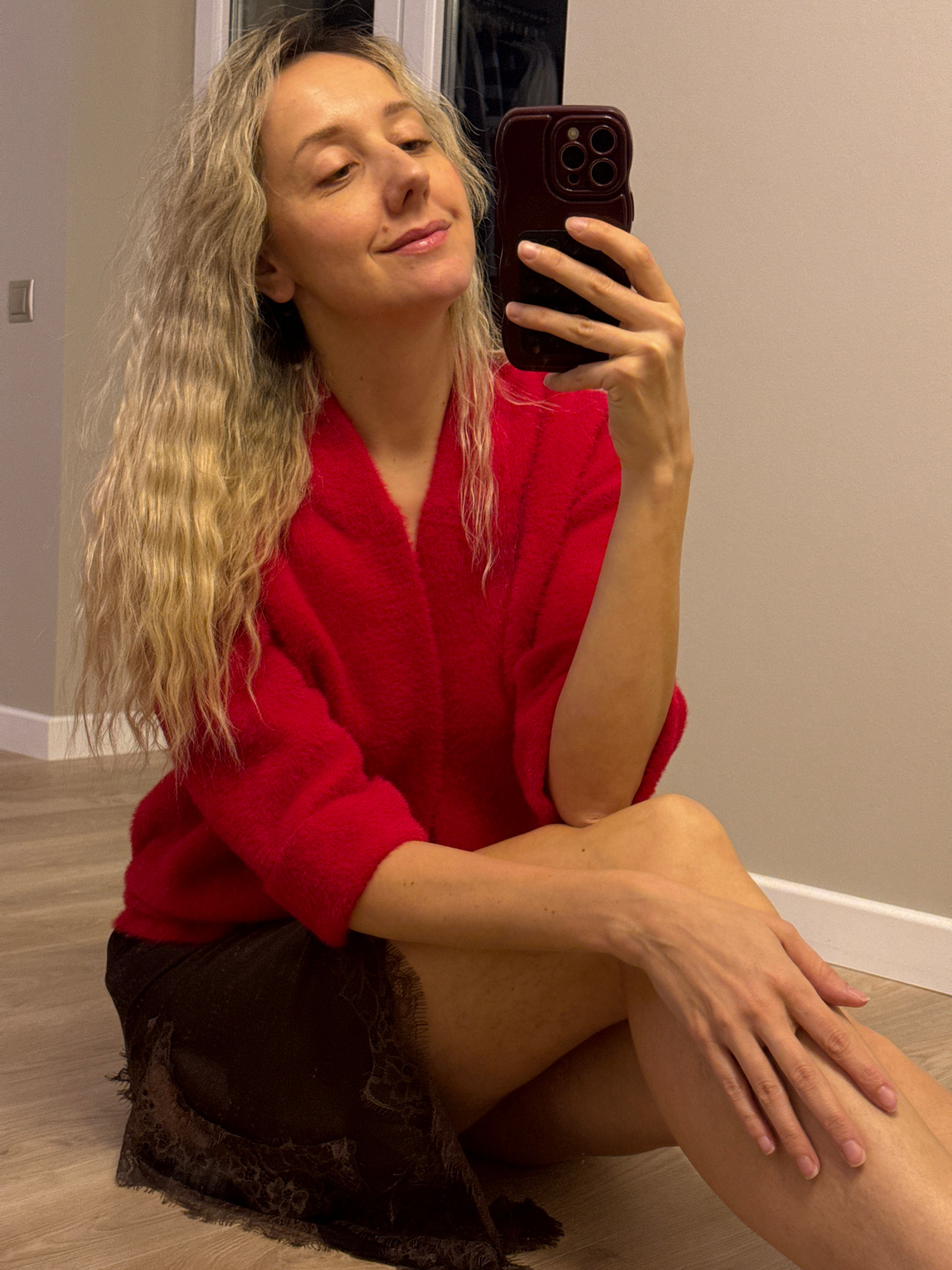 A woman with blonde hair is lying on her side on a wooden floor. She's wearing a red sweater and a dark skirt with lace trim. She's holding a cell phone in her right hand, presumably taking a selfie.…read more