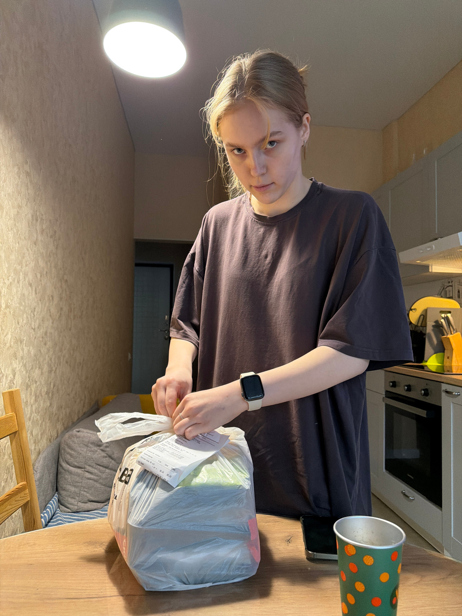 A woman with light blonde hair stands in a kitchen, wearing a dark purple T-shirt and a smartwatch. She is holding a plastic bag full of papers. The kitchen has light-colored cabinets, a microwave, an…read more