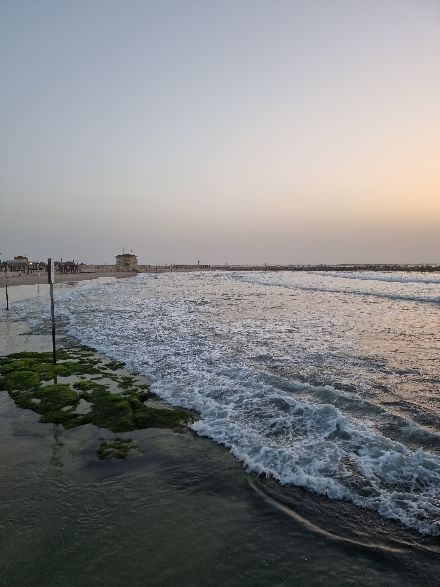 The image shows a view of the Mediterranean coastline in Tel-Aviv, Israel, at what appears to be dusk or dawn due to the soft lighting. Waves crash against the shore, edged with foam, adjacent to a br…read more