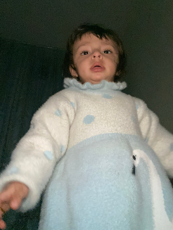 A baby lies on a dark surface, likely a couch or bed. They are wearing a fuzzy, light blue and white romper with blue polka dots and a ruffled collar. The baby's right arm is extended upwards, and the…read more