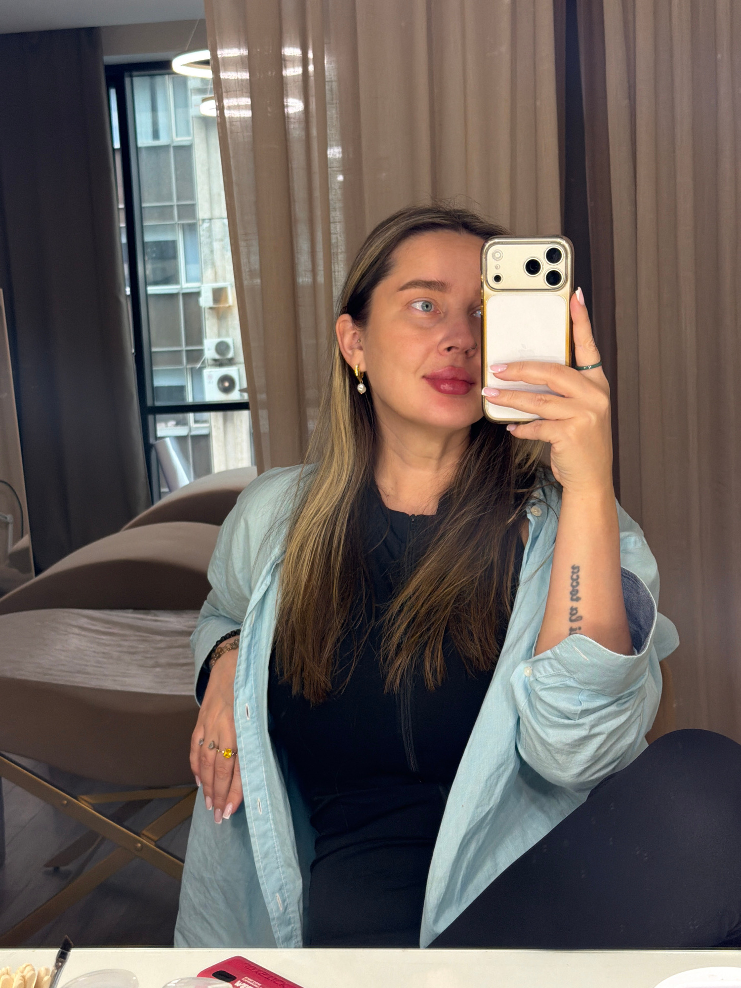 A woman is taking a selfie in what appears to be an indoor setting. She is holding a smartphone with a gold-colored case up to her face. She has brown hair with blonde highlights, wearing a black topβ¦read more