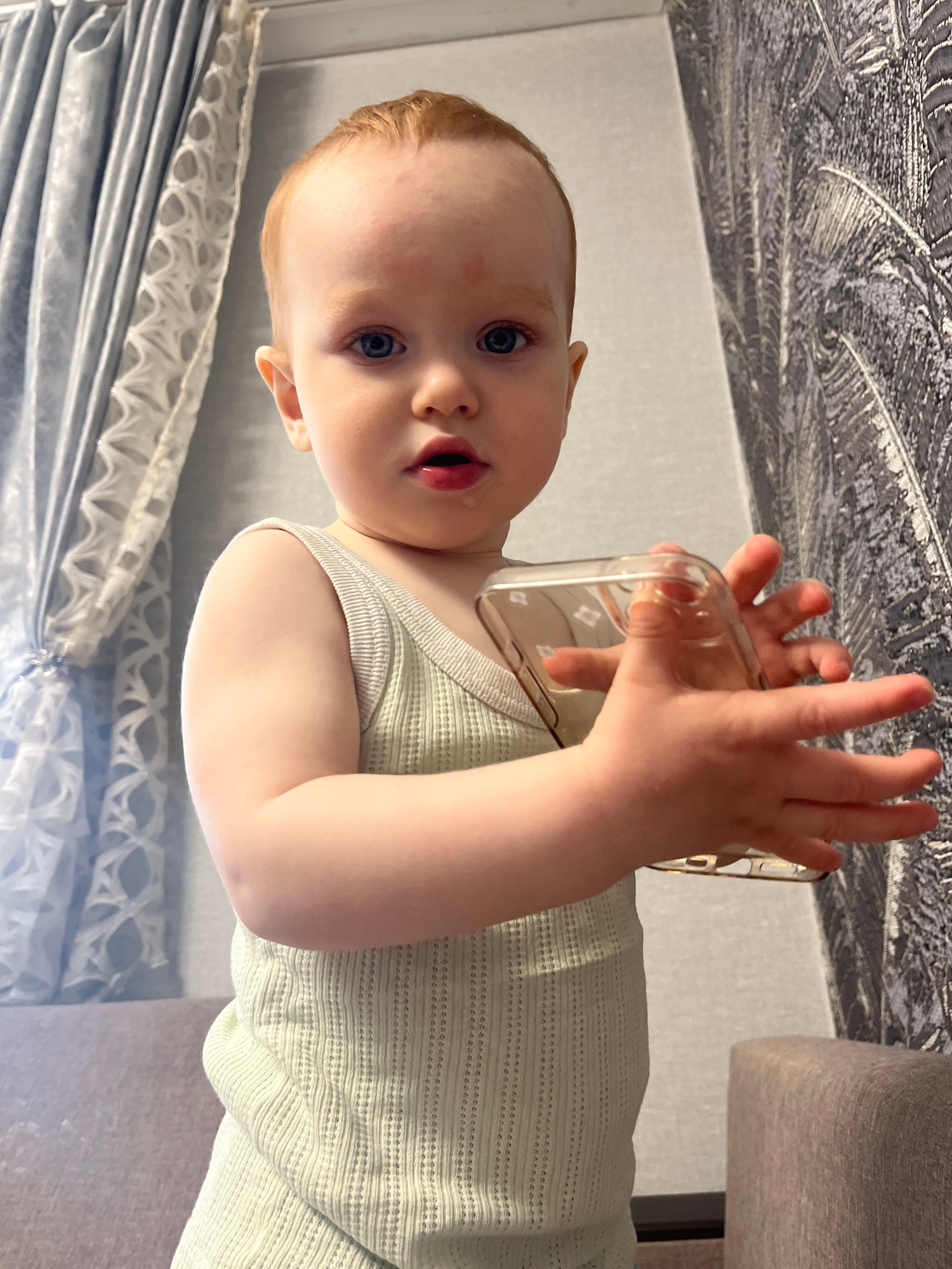 A baby with light skin and red hair is holding a clear phone case with both hands. The baby is wearing a light green tank top. The background includes a grey patterned wallpaper, a white wall, a grey…read more