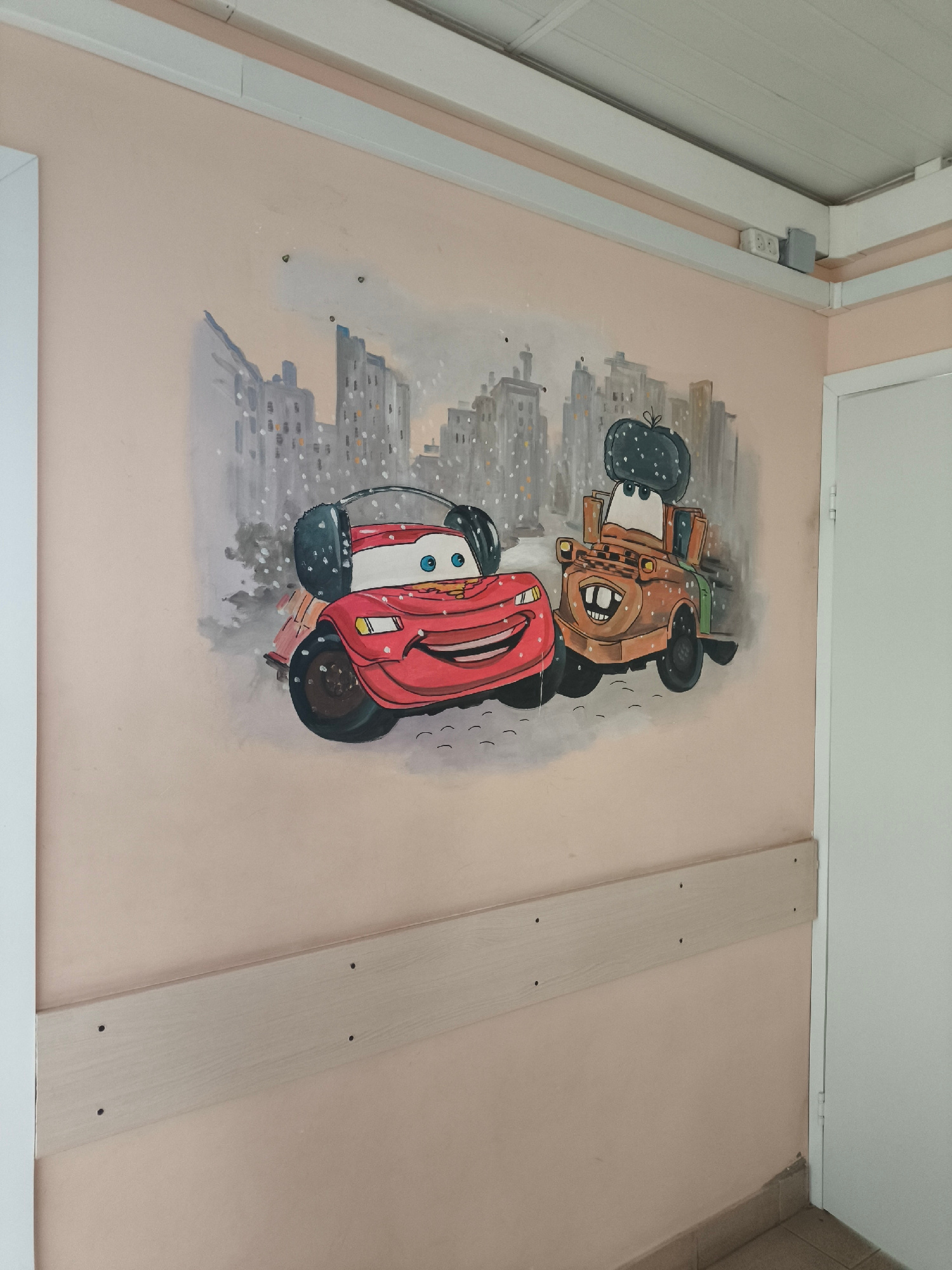A wall mural of cartoon cars is painted on a peach-colored wall. The left side of the mural shows a red car with headphones and a white roof. The right side of the mural shows a brown tow truck wearin…read more