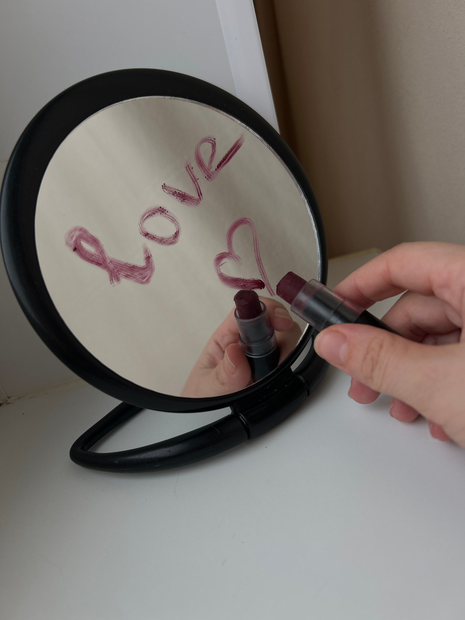 A hand holds a tube of red lipstick, writing "love" and a heart on a round, black-framed mirror. The mirror is positioned against a white wall in an indoor space. The specific location in Ufa, Russia,…read more