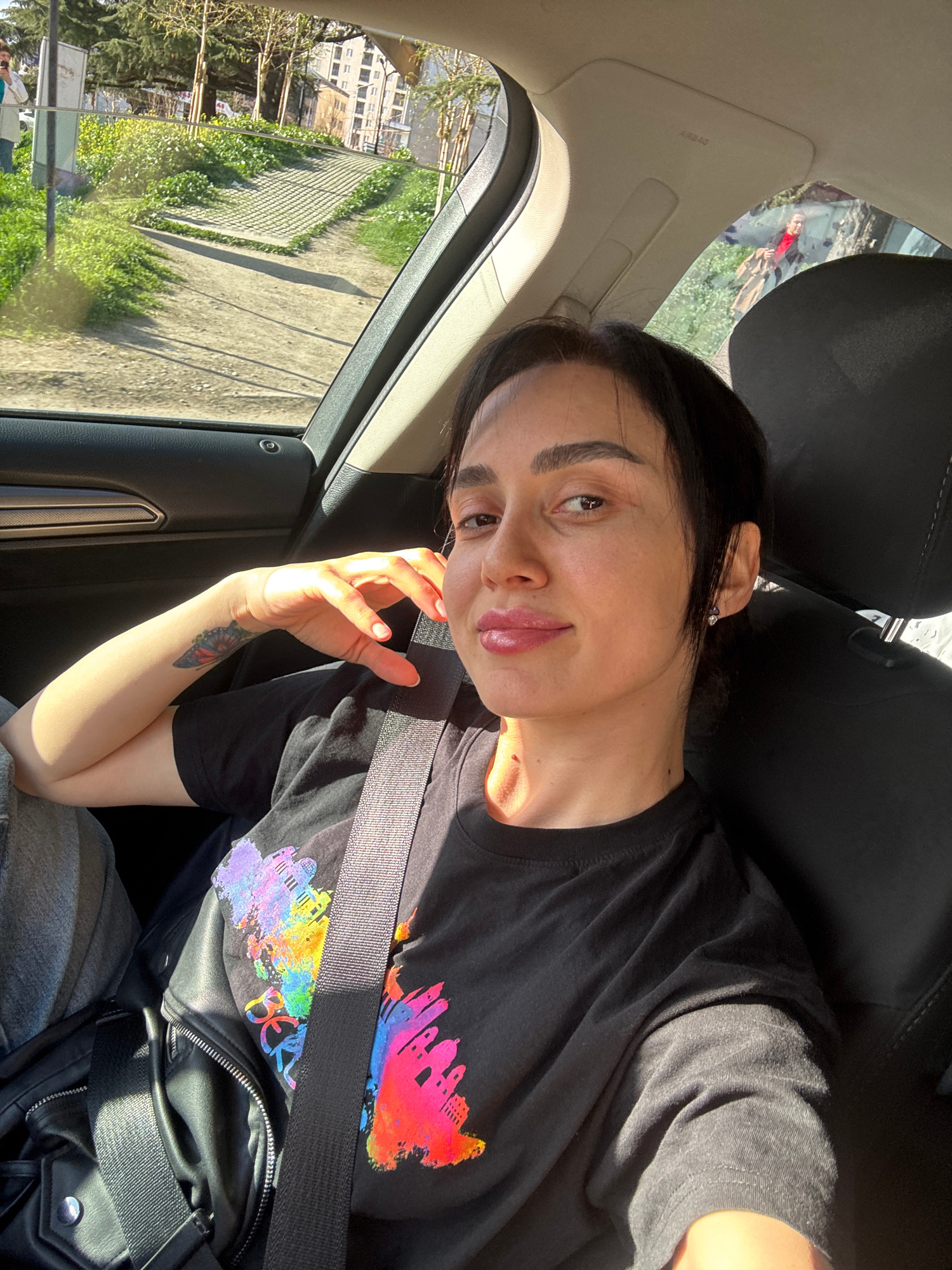 A woman is taking a selfie in the passenger seat of a car. She has dark hair pulled back, is wearing a black T-shirt with a colorful design, and has a seatbelt on. She's wearing a black crossbody bag. Outside the car window, there's a view of a sidewalk, grass, trees, and buildings. It appears to be Tbilisi, Georgia, due to the architectural style and general appearance of the buildings outside the window. The light suggests it's daytime. A person is visible in the car's sunroof. | Open Wire