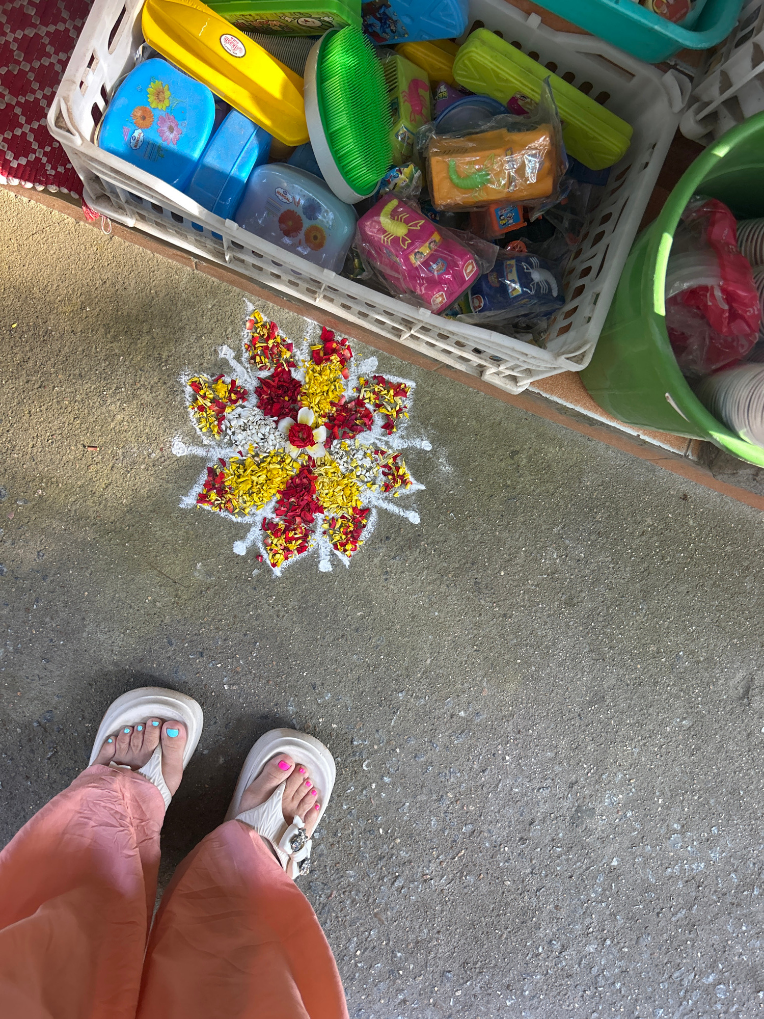 The image depicts a ground-level view in Puttaparthi, India, showcasing a colorful floral Rangoli design created from flower petals. The Rangoli, composed primarily of red, yellow, and white petals, i…read more