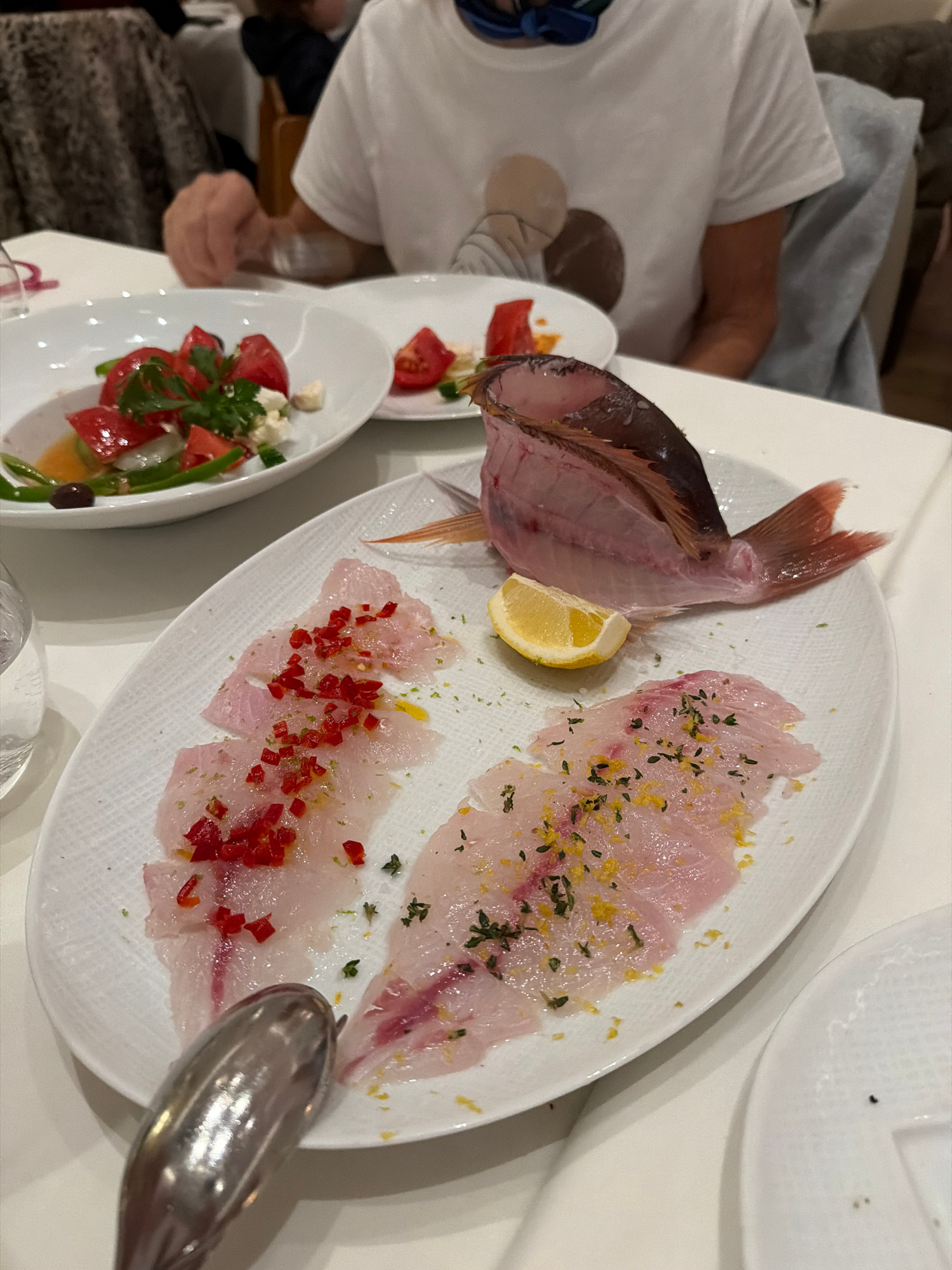 The image depicts a dining scene inside a restaurant in Athens, Greece. The foreground is dominated by a white oval plate featuring a deboned reddish-brown fish presented upright with its head and tai…read more