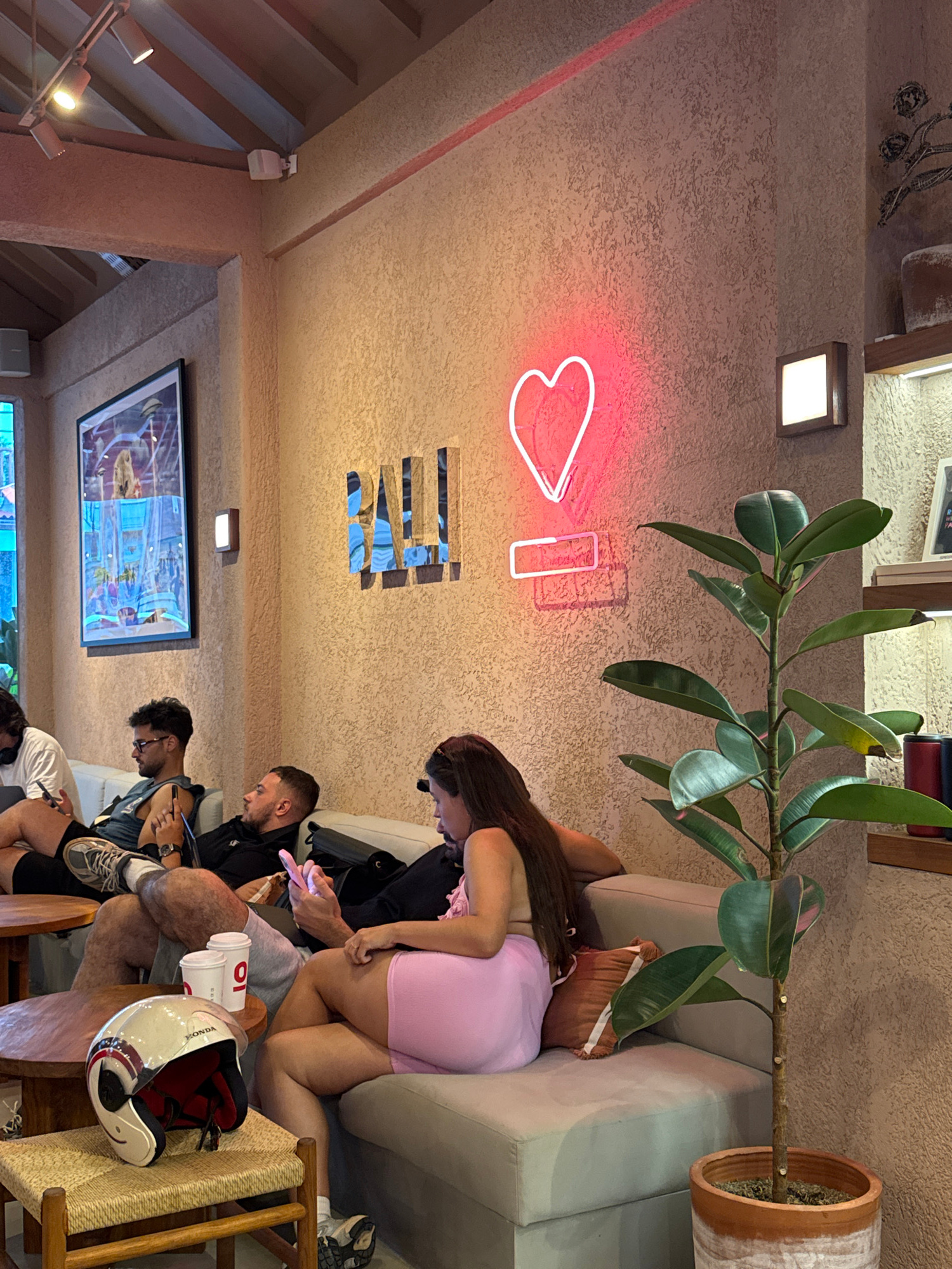 The image captures an indoor scene, likely a cafe or lounge, featuring several young adults engaged in casual activities. The setting includes textured walls and ceiling, with prominent structural bea…read more