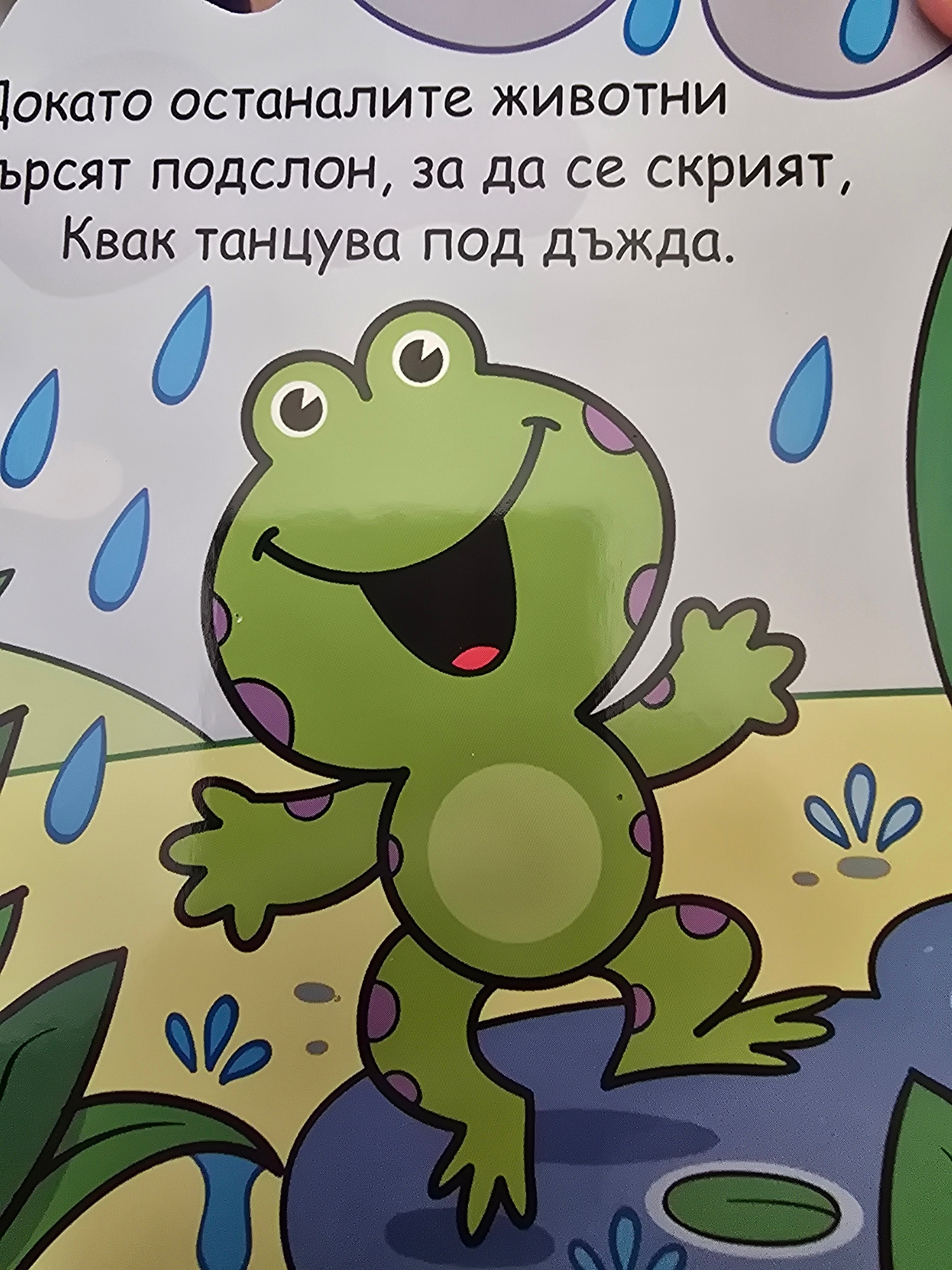 Here is a description of the image: The image shows a cartoon illustration of a green frog with purple spots, positioned next to Bulgarian text on the left side of the frame. The frog is smiling and…read more