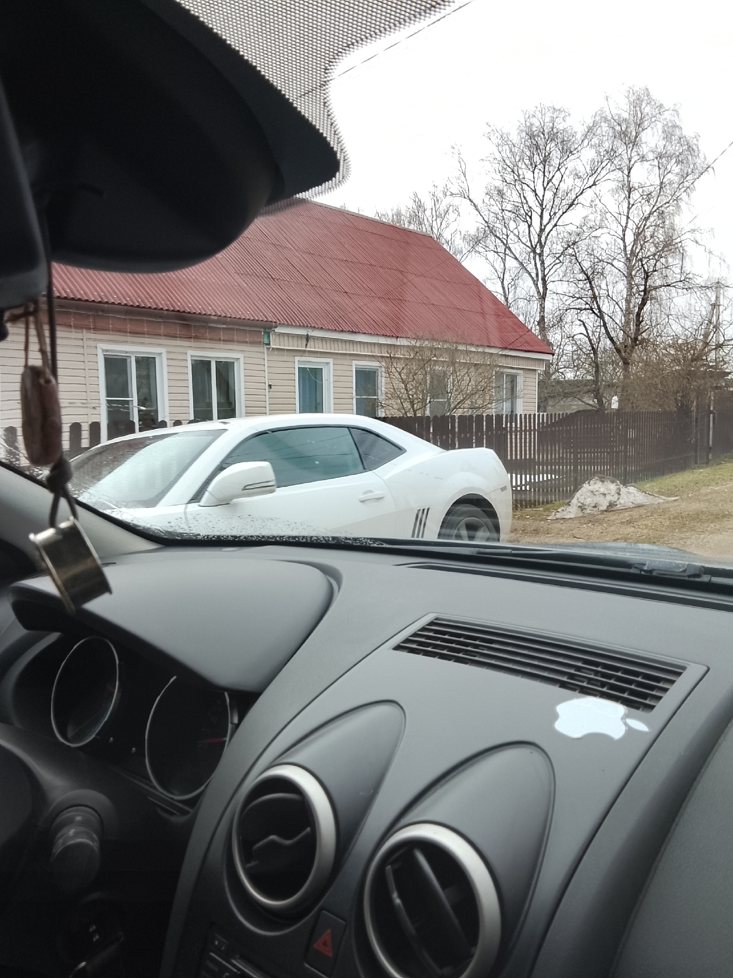 The image shows a white Chevrolet Camaro parked on a street in Высокиничи, Russia. The photo is taken from inside another car, with the dashboard and part of the windshield visible. The Camaro is park…read more