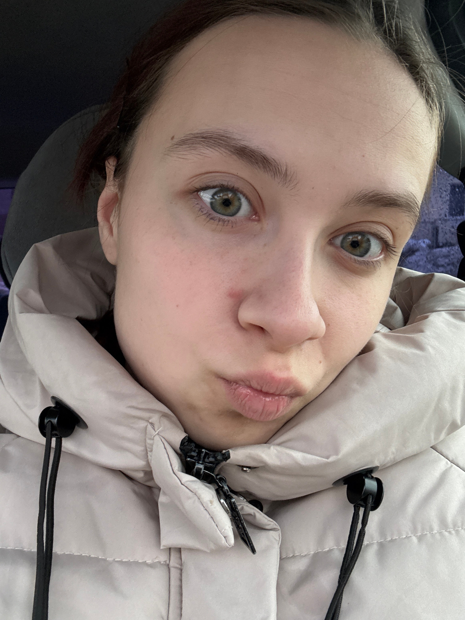 A close-up, angled portrait shows a young woman with fair skin and light brown eyebrows and hair, wearing a light beige puffer jacket. Her eyes are green, and she has a mole on her cheek. She is makin…read more