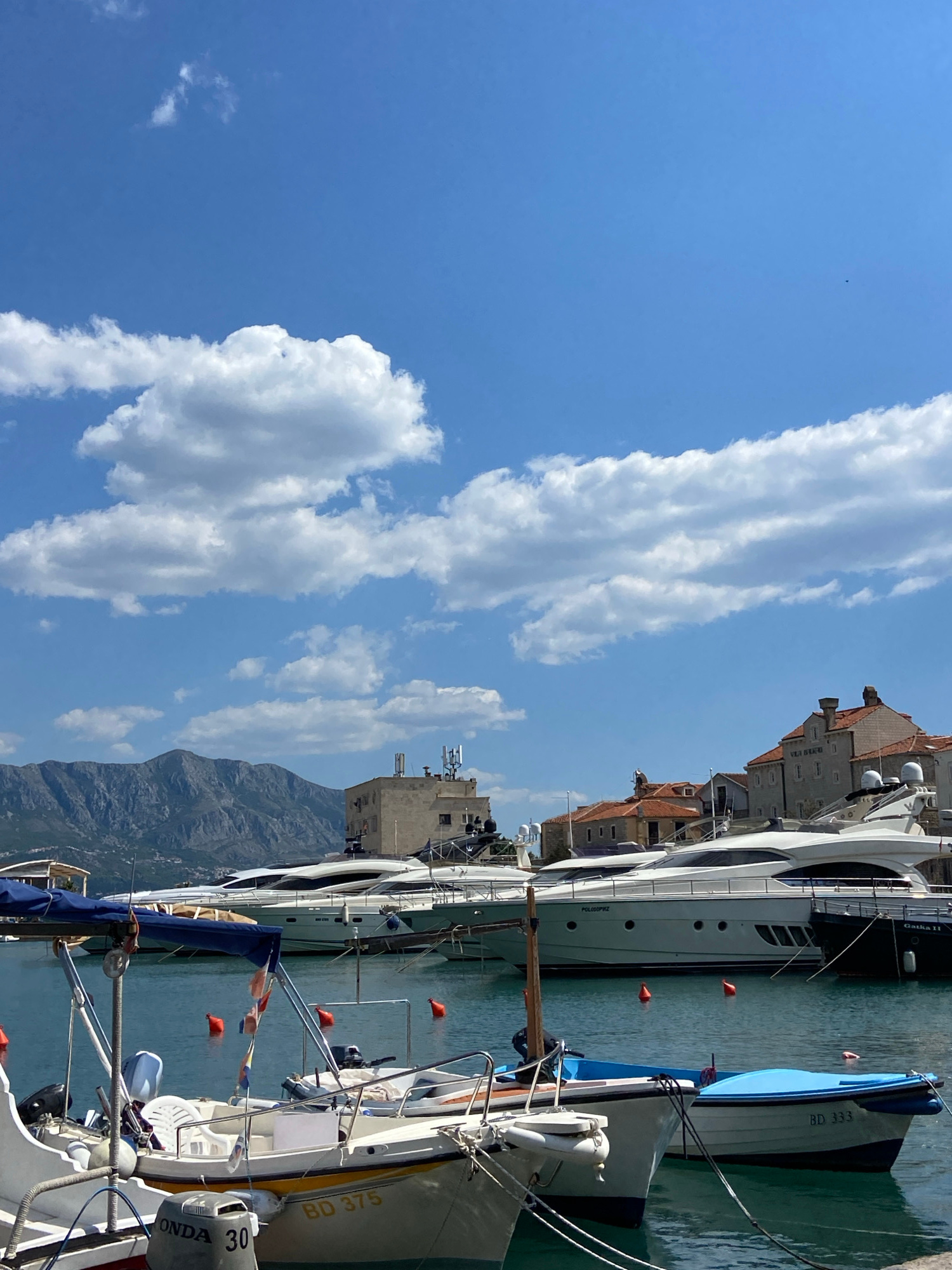The image shows a marina in Budva, Montenegro, with a bright blue sky overhead. Cumulus clouds fill the sky. Several boats and yachts are moored in the marina. In the background, there is a mountain r…read more