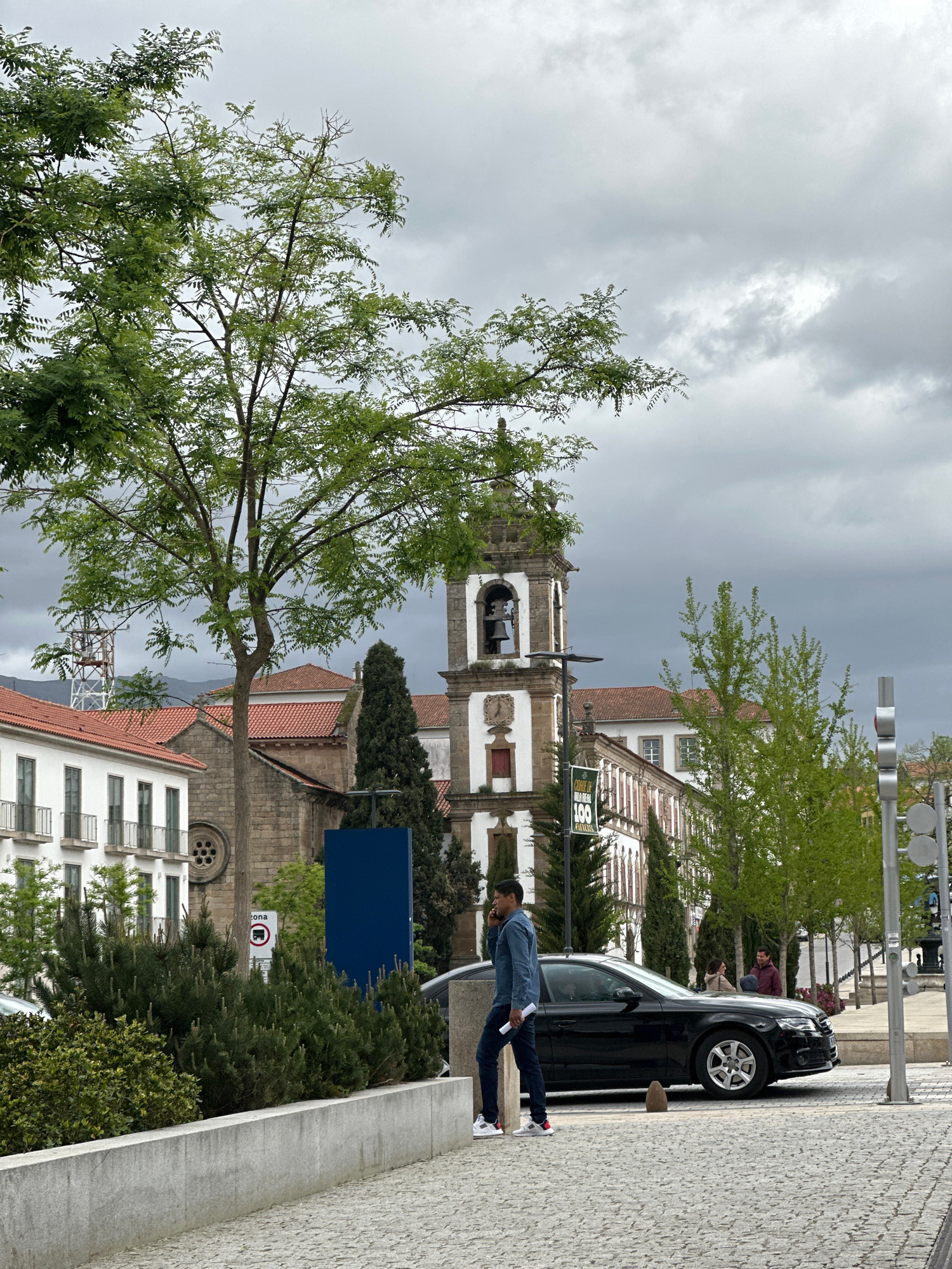The photograph presents a street scene in Vila Real, Portugal, set under a cloudy, overcast sky. The foreground features a leafy tree to the left, partially obscuring the view. A black vehicle is park…read more