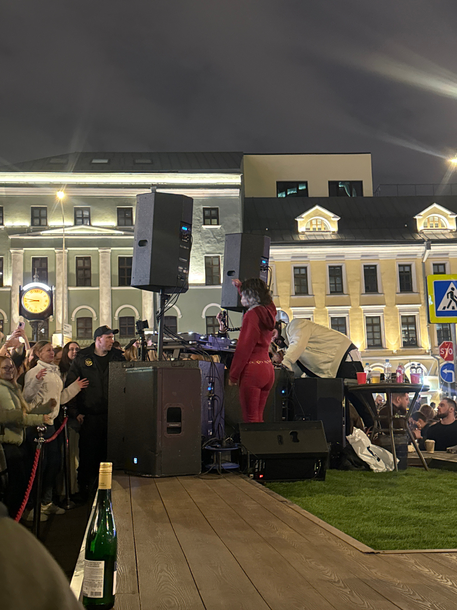 The image shows an outdoor setting at night in Moscow, Russia, with a live music performance. A building with multiple windows and architectural details is visible in the background, along with a cloc…read more