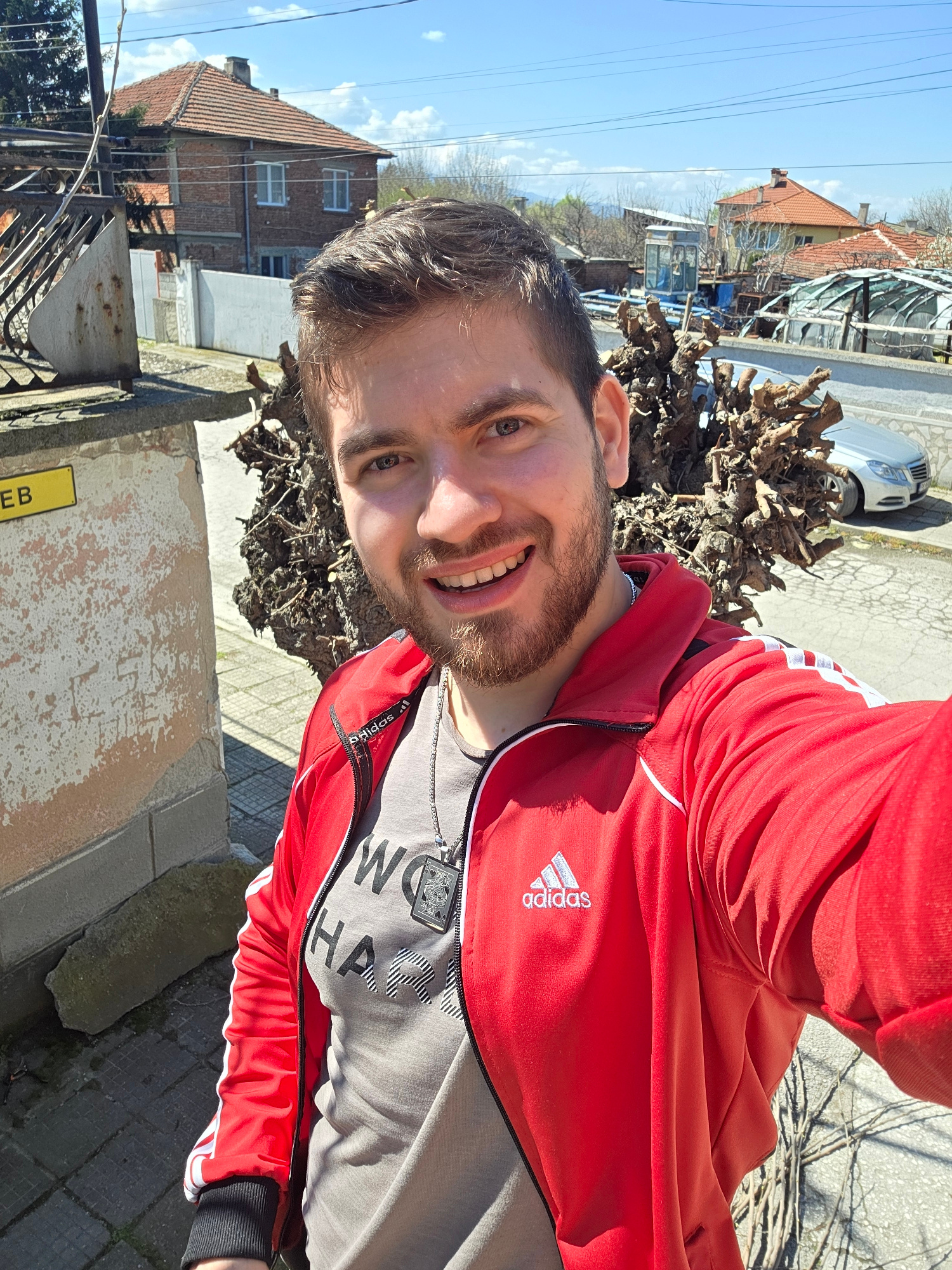 A selfie shows a man in Yagodovo, Bulgaria. The man wears a red Adidas jacket over a gray shirt with black and white stripes. He has brown hair and a beard. The background includes a street scene with…read more