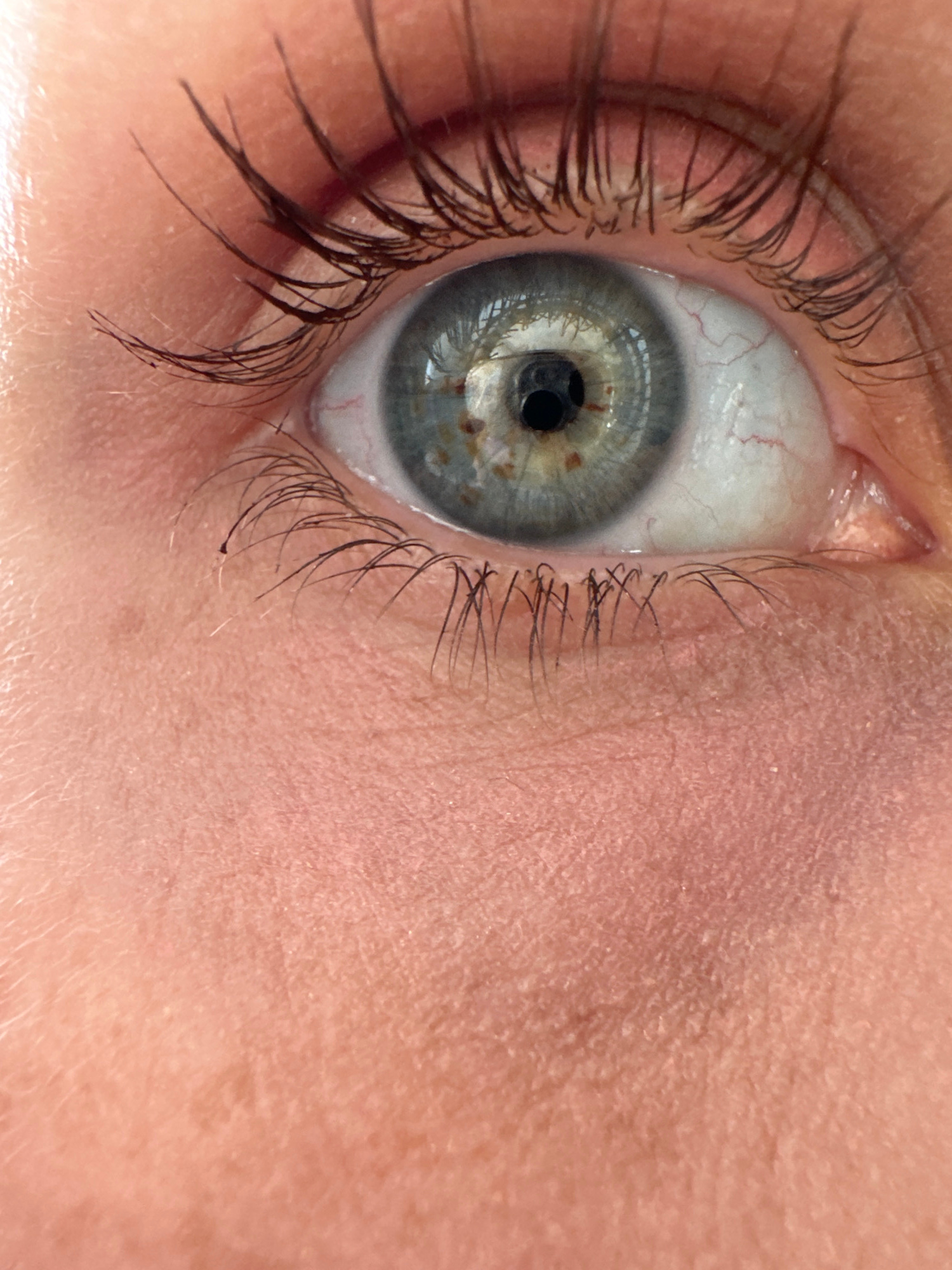 A close-up image depicts a human eye, with a predominantly blue-gray iris containing speckles of color. The pupil is black and round. Visible blood vessels are present in the white part of the eye. Ey…read more