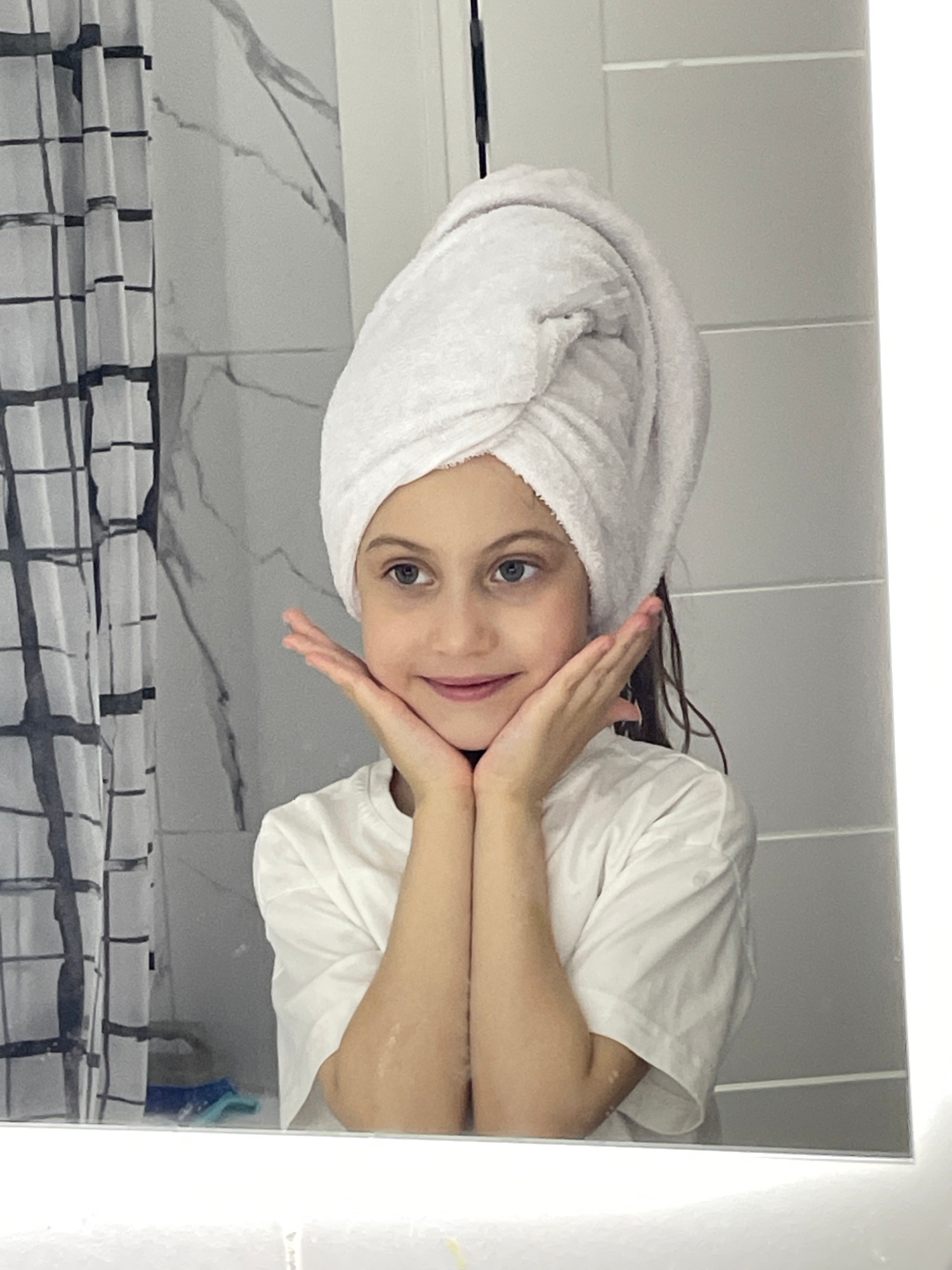A young girl with fair skin, light brown hair, and grey eyes is reflected in a bathroom mirror. She is wearing a white t-shirt and a white towel wrapped around her head. Her hands are gently placed on…read more