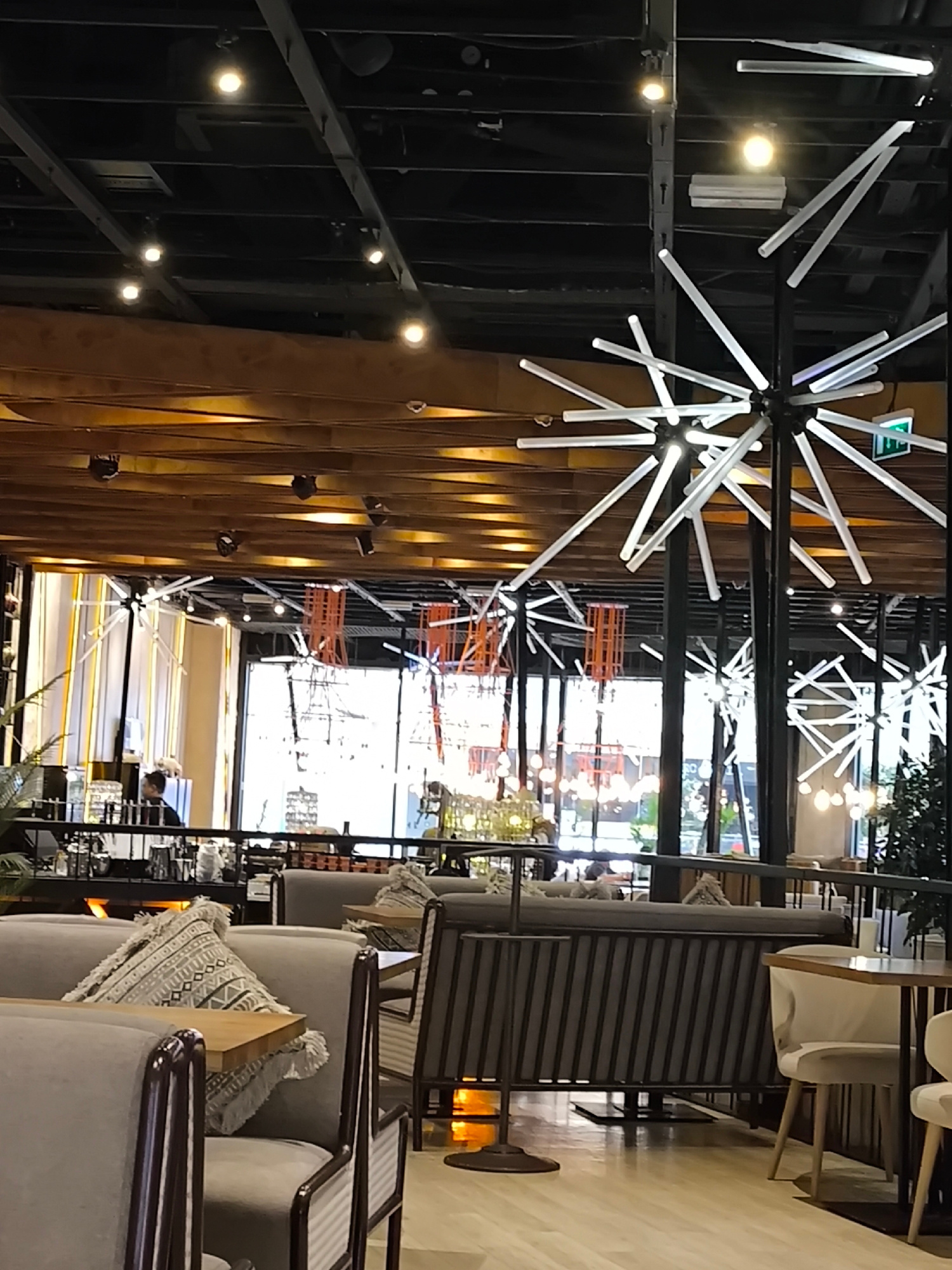 The image depicts the interior of a cafe located in Khimki, Russia. The cafe appears to be modern and spacious, with a high ceiling featuring exposed black beams and a wooden structure. Several pendan…read more
