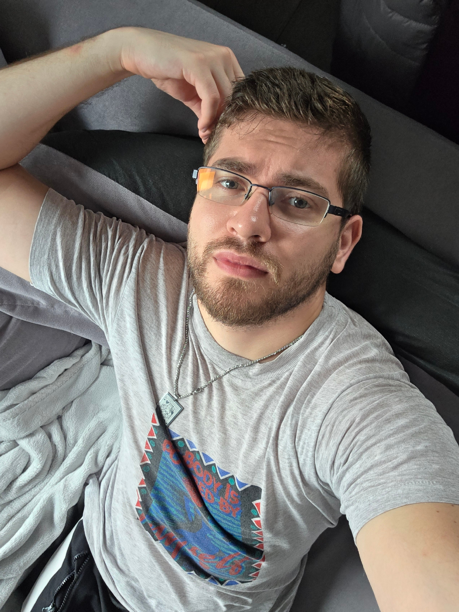 A Caucasian male with a light beard and wearing glasses is lying on a dark grey sofa. He is wearing a light grey t-shirt with a blue and red design on the chest. He has a silver chain necklace. His ri…read more