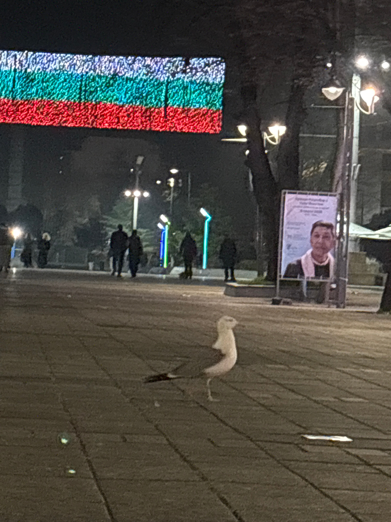 The image depicts a street scene at night. A vertical display of lights in the colors of the Bulgarian flag (white, green, red) is on the left. In the center, there is a poster featuring a man's face.…read more