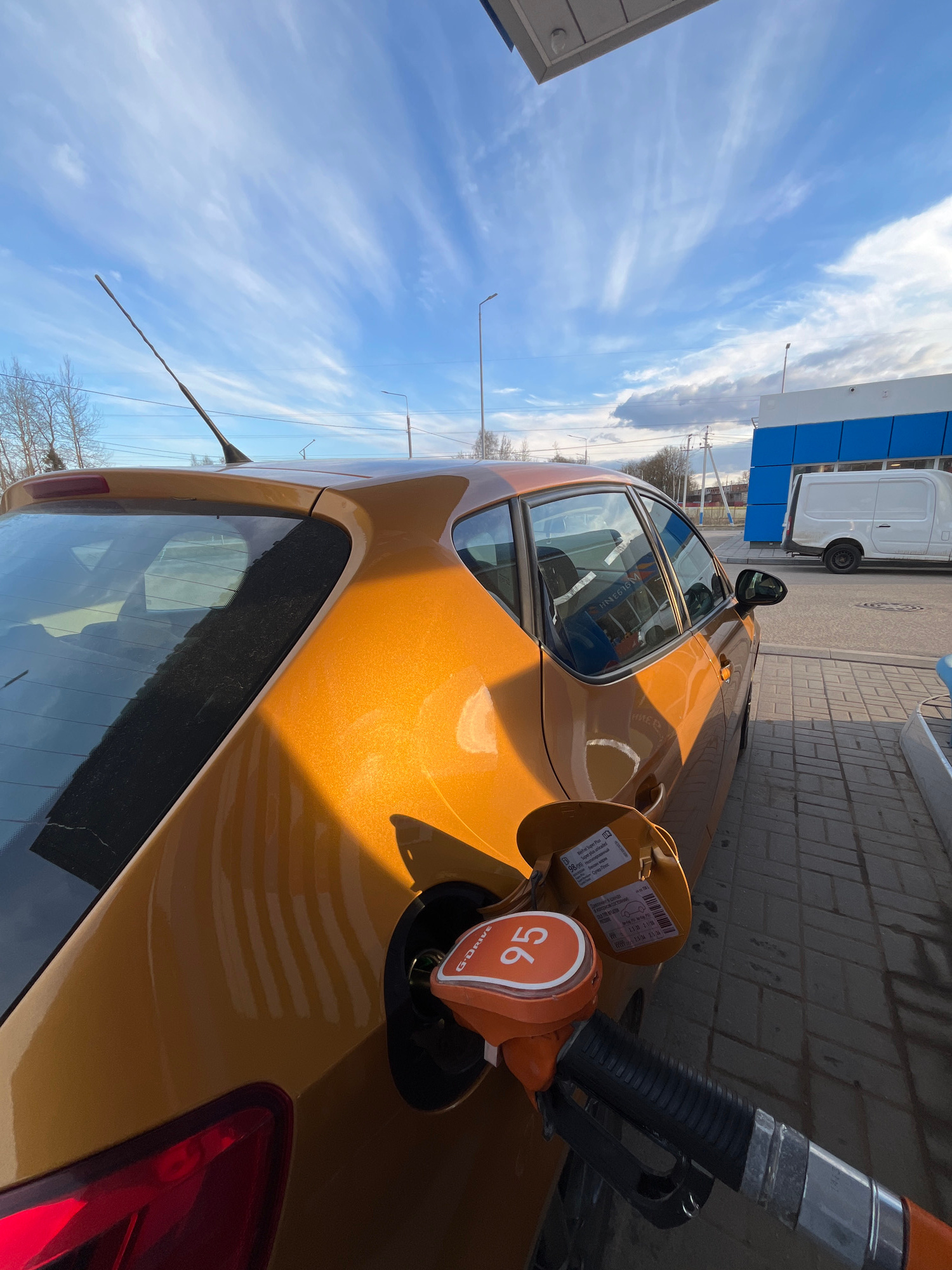 Here is a detailed description of the image: **Scene**: An eye-level, outdoor shot depicts a golden-colored car being fueled at a gas station. **Subjects/Objects**: - A gas pump nozzle, marked with…read more