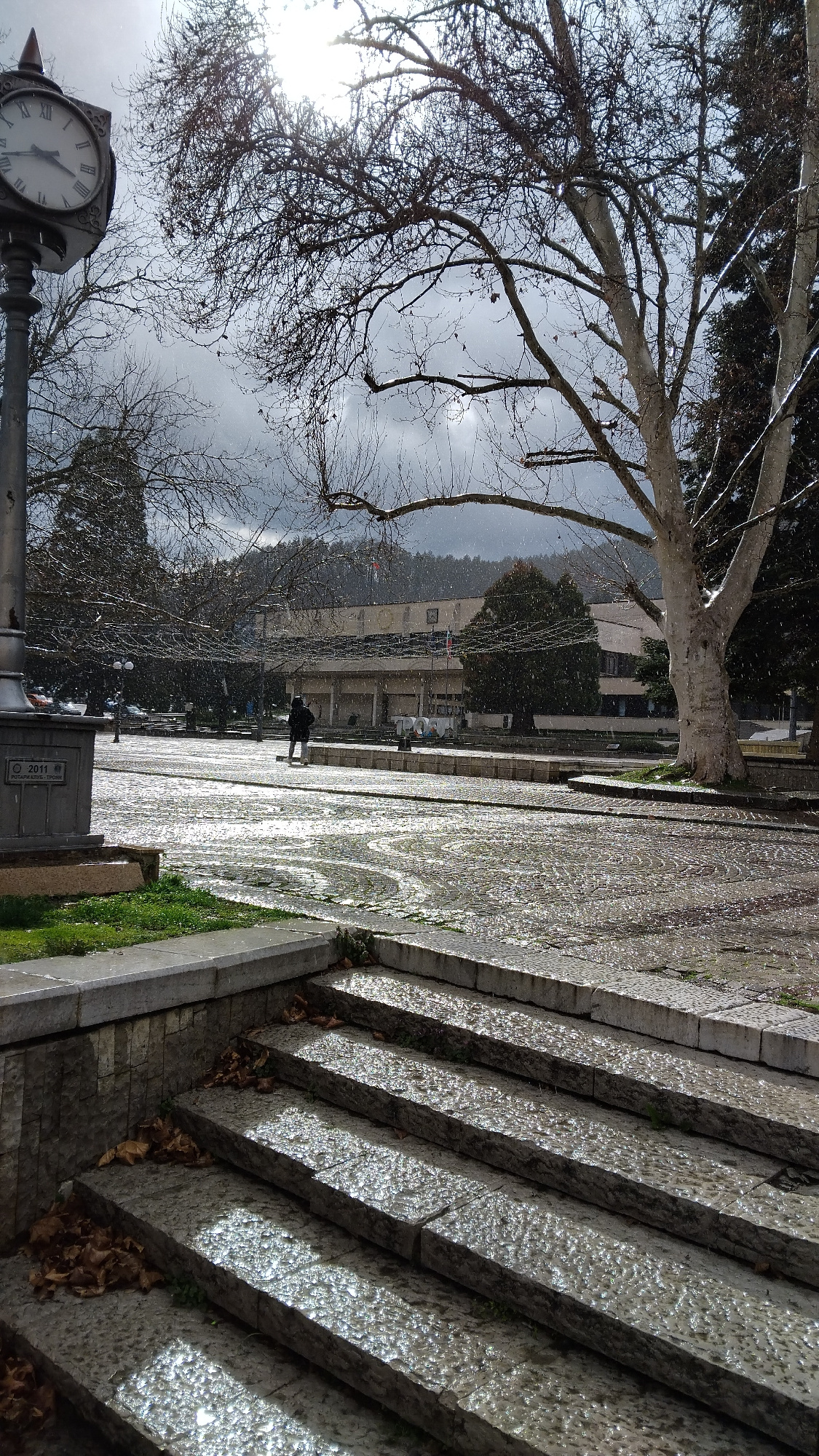 The image portrays a public square in the city of Troyan, Bulgaria, during a period of light snow or sleet. The environment is characterized by a bright, partially cloudy sky and wet, reflective surfa…read more