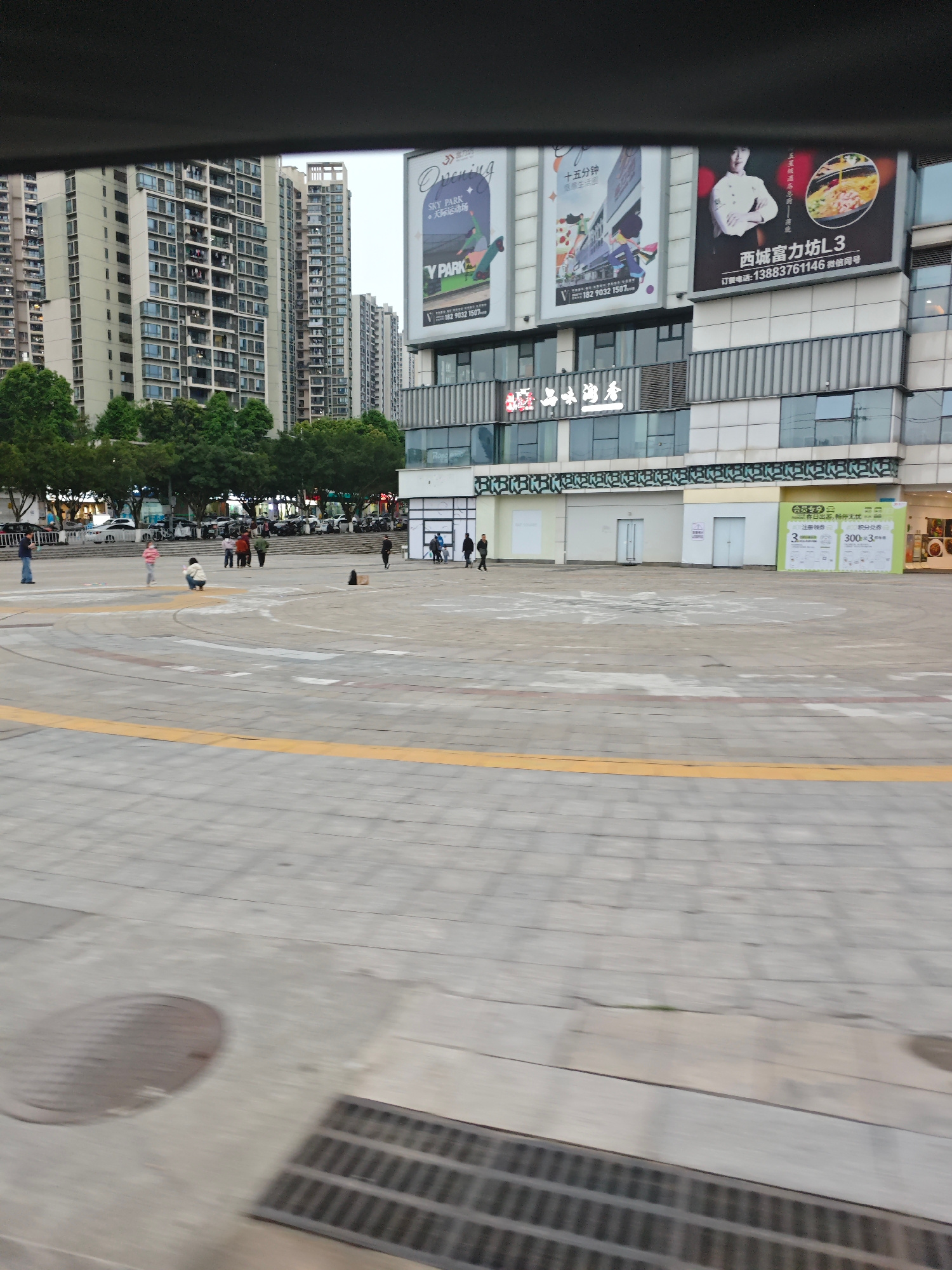 This image depicts a large, open public square located in the Chongqing High-tech Zone, China. It features buildings in the background, with visible advertisements for "SKY PARK," "Y PARK," and "西城富力坊…read more