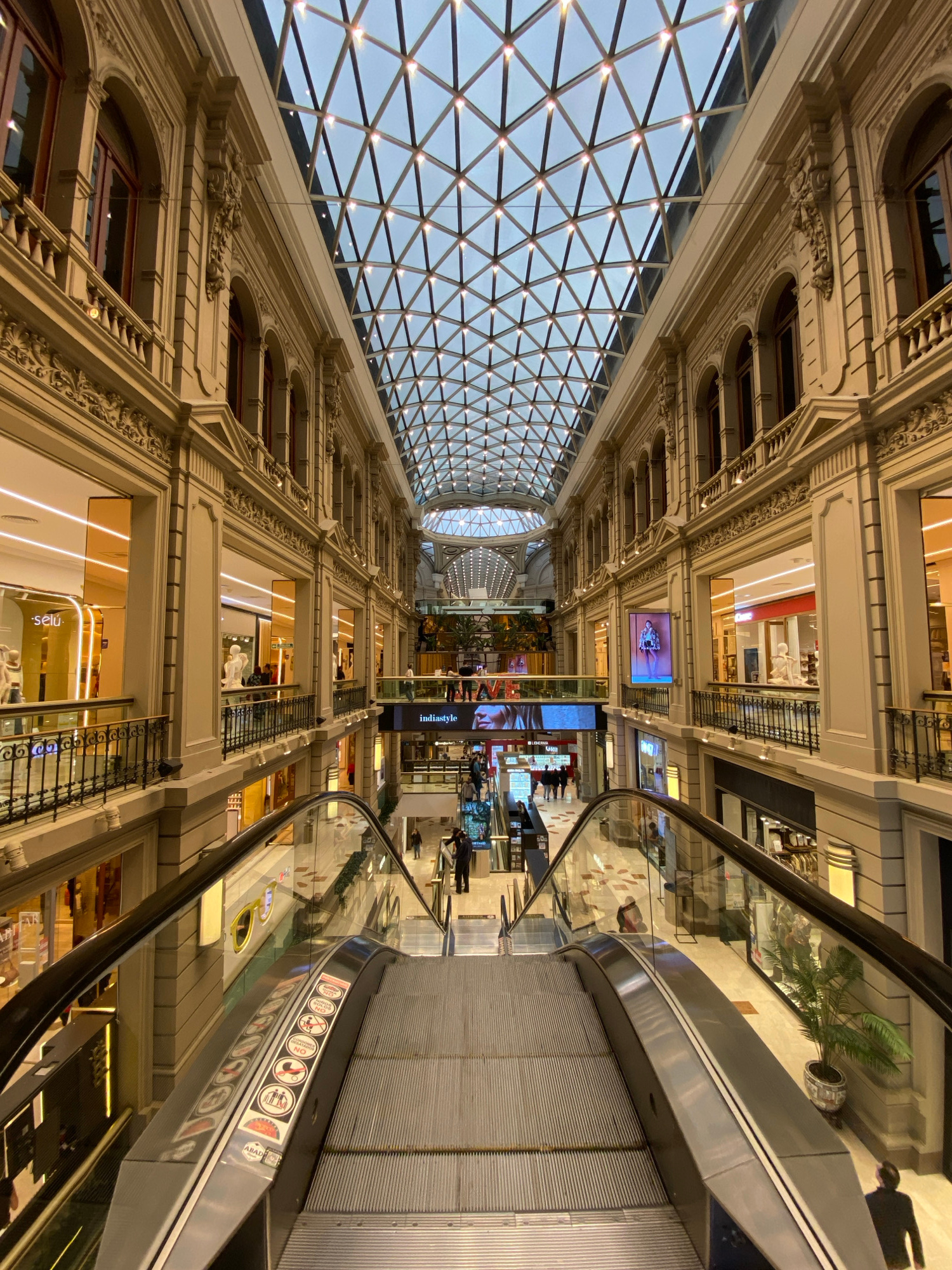 The image captures the interior of Galerías Pacífico, a shopping mall in Buenos Aires, Argentina. The camera is positioned looking up, emphasizing the architecture. A large, ornate ceiling with a geometric glass pattern allows natural light to flood the space. Multiple levels of retail spaces line both sides of the mall, with escalators providing access between floors. People can be seen on different levels, browsing or walking. The architectural details are elaborate, featuring decorative moldings, arches, and balconies. The escalator, with its glass railings and warning signs, is a prominent feature in the foreground. | Open Wire
