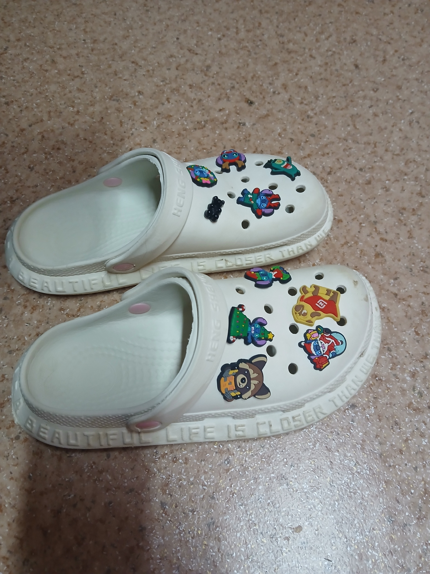Two white Croc-style sandals are arranged side-by-side on a beige tiled surface. The sandals are decorated with cartoon character charms in various colors and designs. The sandal on the right has text…read more