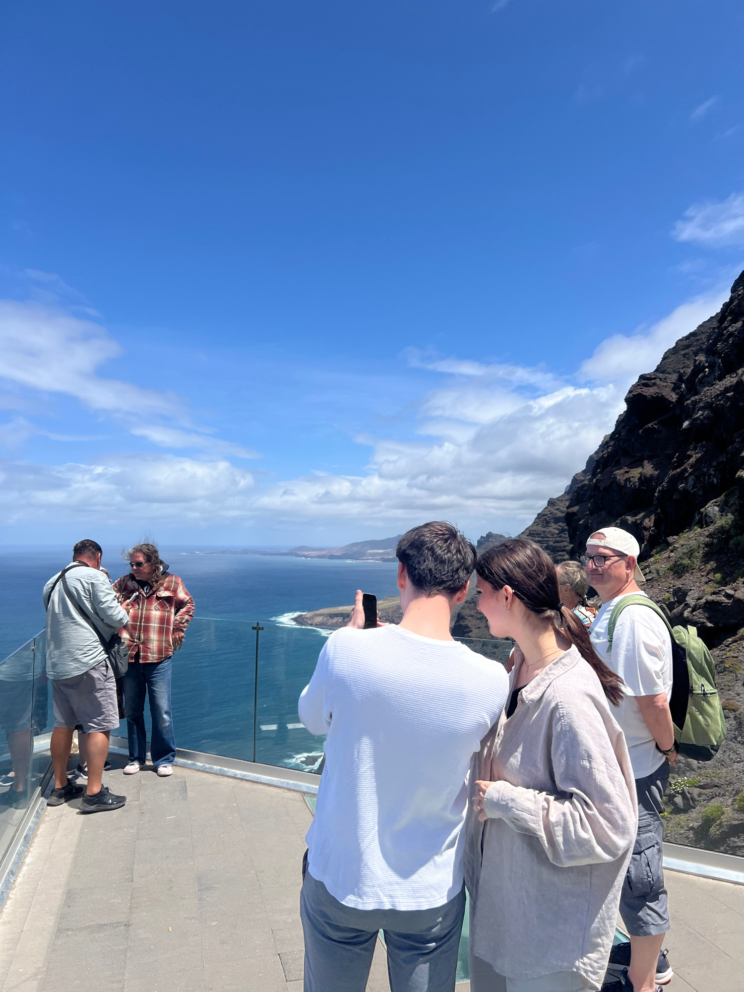 The image shows a group of tourists at the Mirador del Balcón in Barranco de Guayedra, Spain. Three people are positioned closer to the viewpoint edge, looking out towards the ocean, one of whom is ta…read more