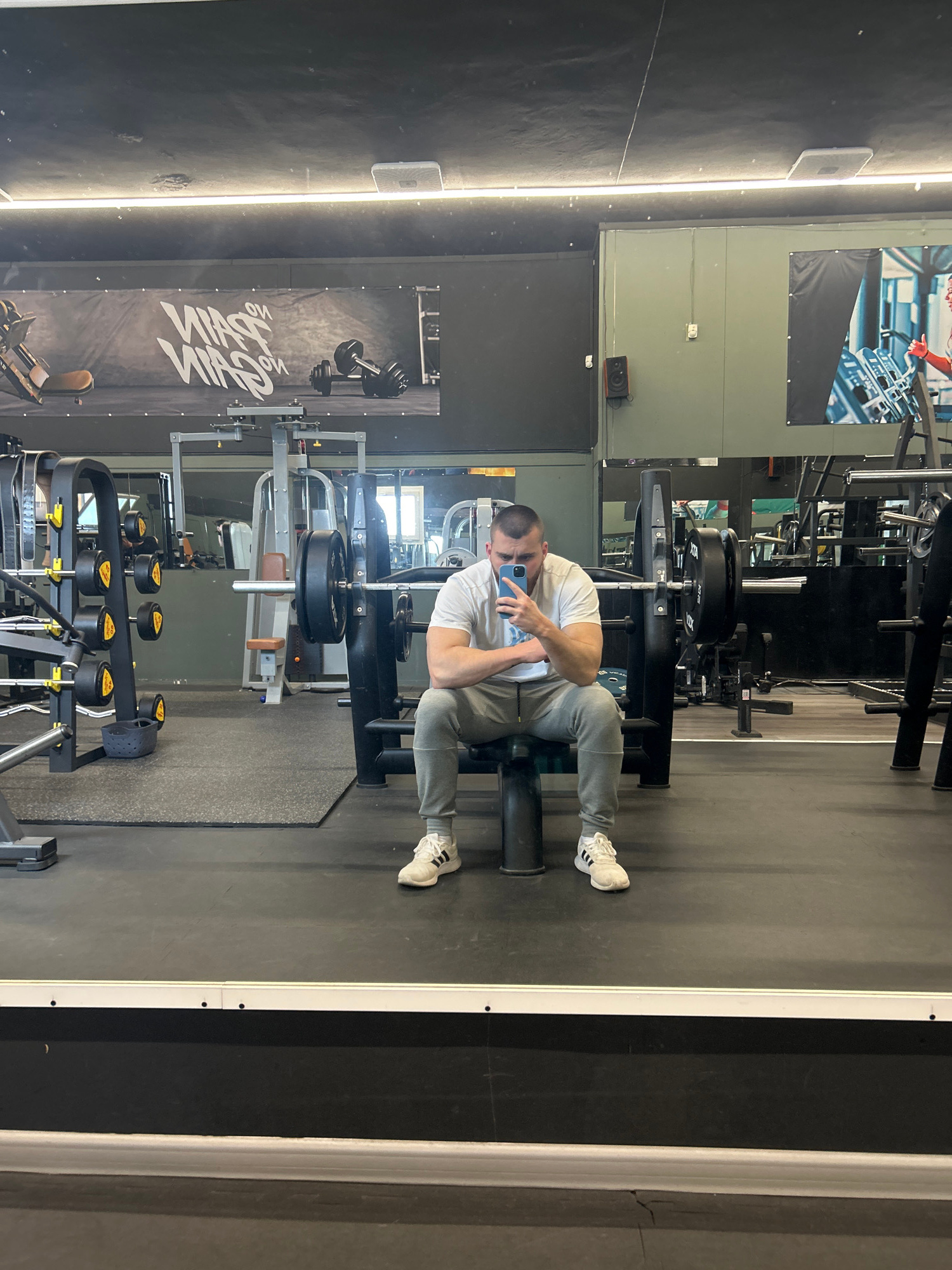 The image captures a man taking a mirror selfie inside a gym, located in Chirpan, Bulgaria. The gym features a dark aesthetic with black or dark grey walls and floor, complemented by bright linear LED…read more