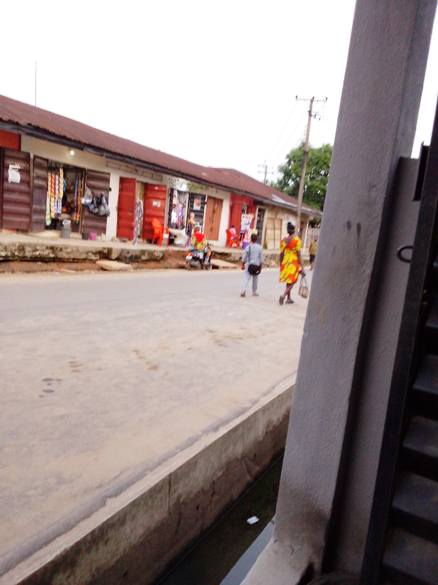 A street scene in Aba, Nigeria, is presented from a high-angle vantage point, partially obscured by a concrete structure. The street has a low-lying concrete barrier along its edge, concealing a drain…read more