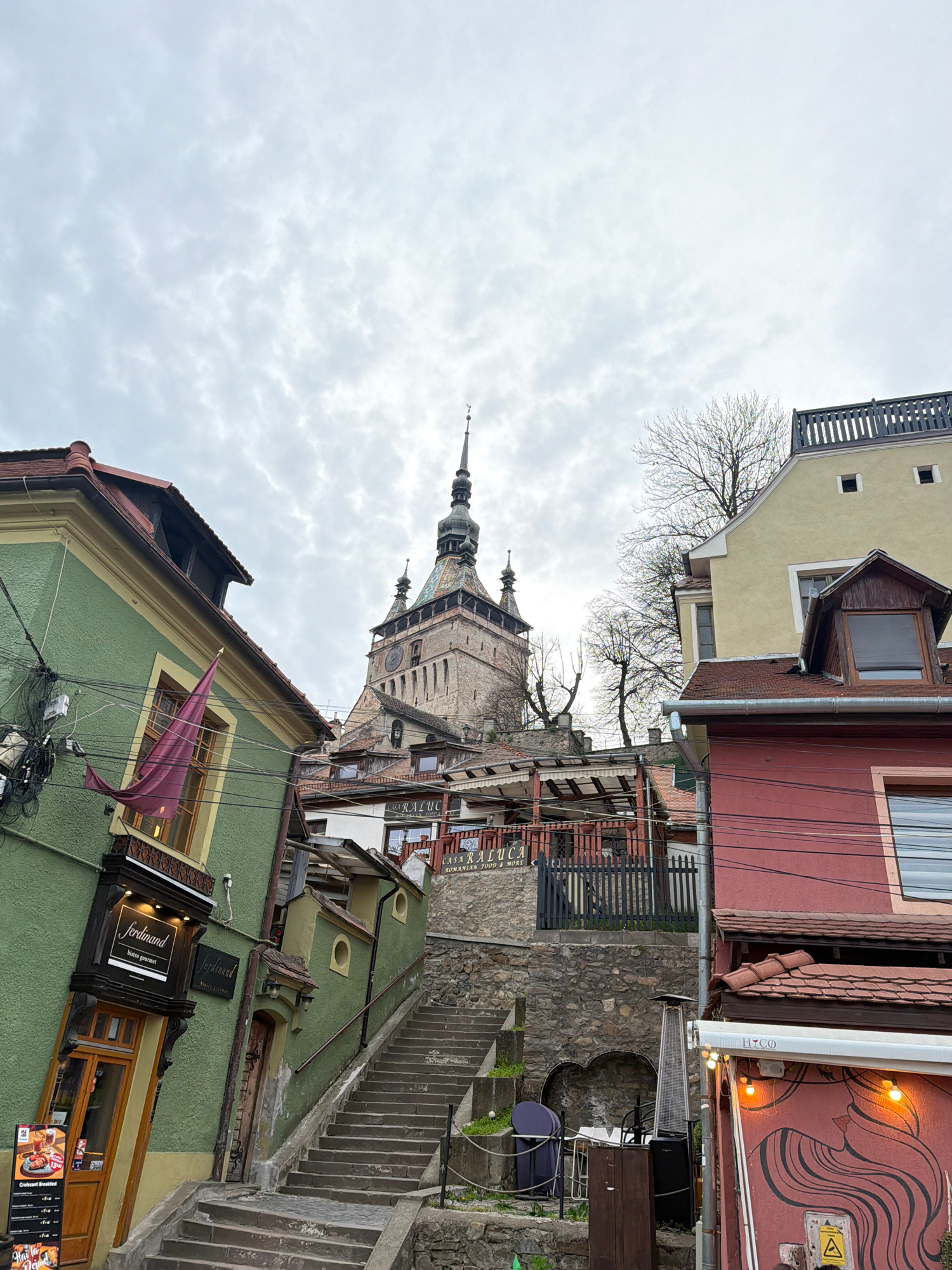 The image showcases a street view in Sighișoara, Romania, characterized by historical architecture and narrow, ascending pathways. In the foreground, a green building with a sign indicating "Ferdinand…read more