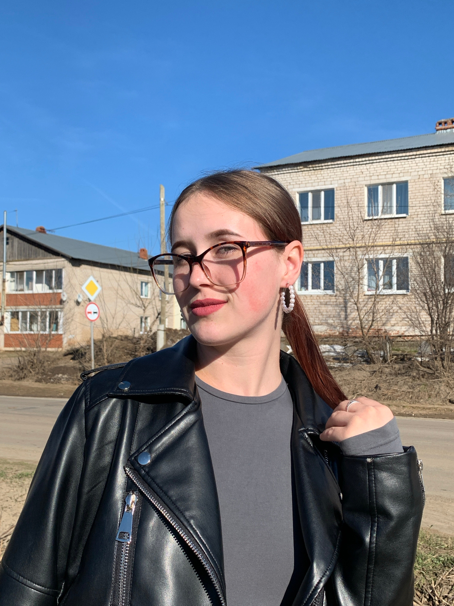 The image is a slightly tilted, close-up outdoor portrait of a young person, likely female, captured on a bright, sunny day. The subject is positioned on the right side of the frame, looking towards t…read more