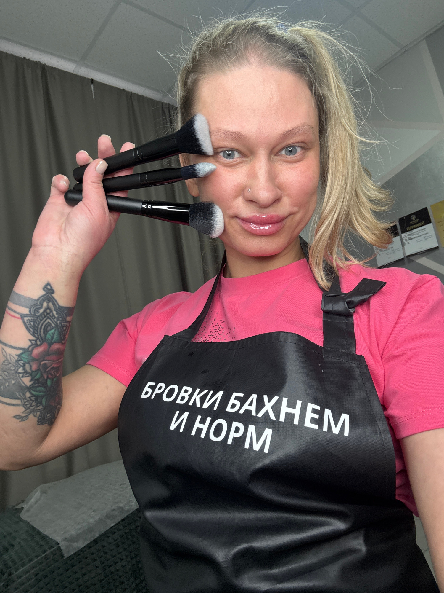 A medium shot shows a light-skinned woman holding three makeup brushes in her left hand. She has blonde hair and blue eyes and is wearing a pink T-shirt and a black apron with white lettering in Russi…read more