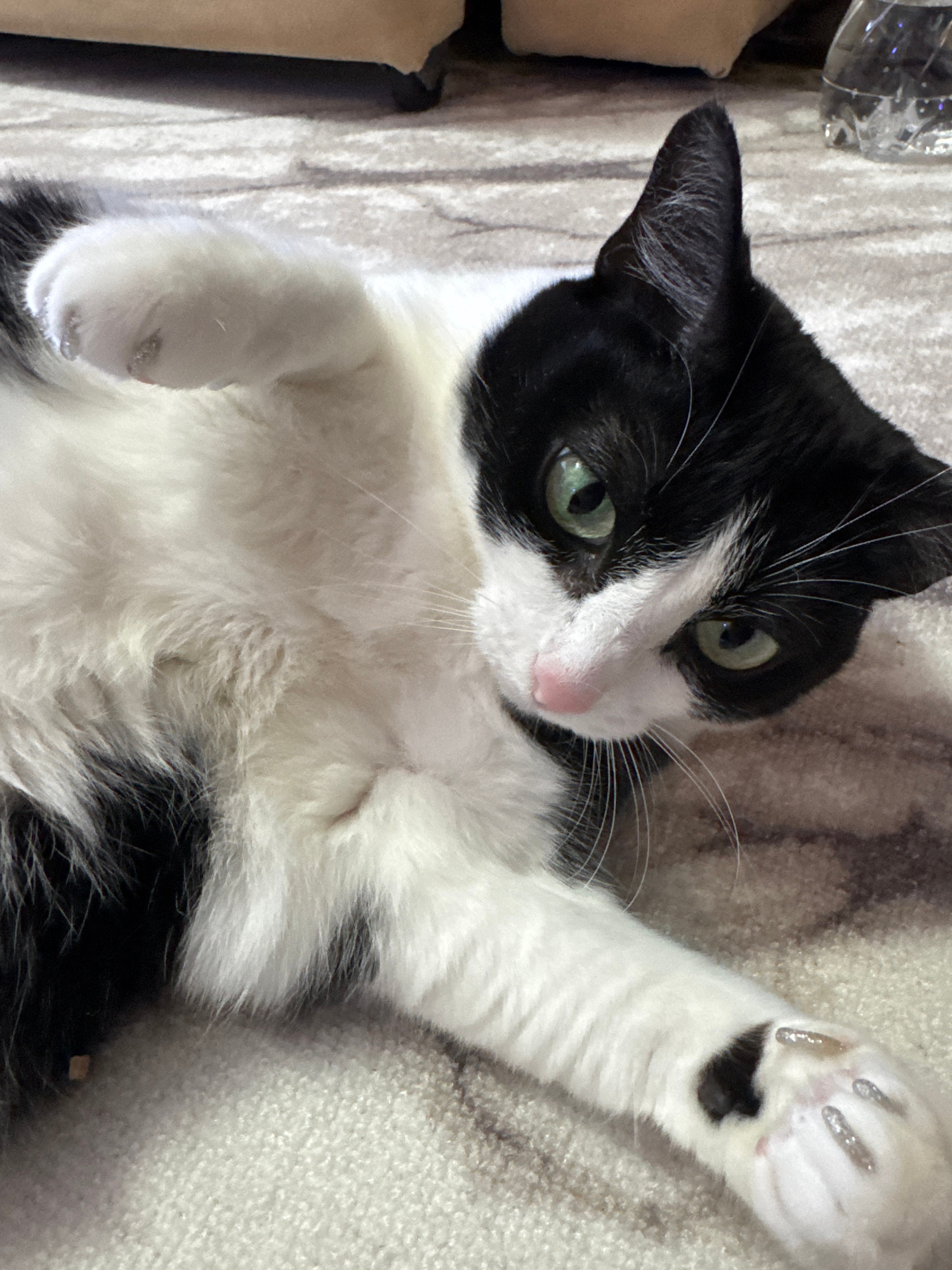 A black and white cat is lying on its back on a gray textured surface, likely a rug or blanket. The cat's head is angled towards the upper left, and it is looking at the camera with green eyes. One pa…read more