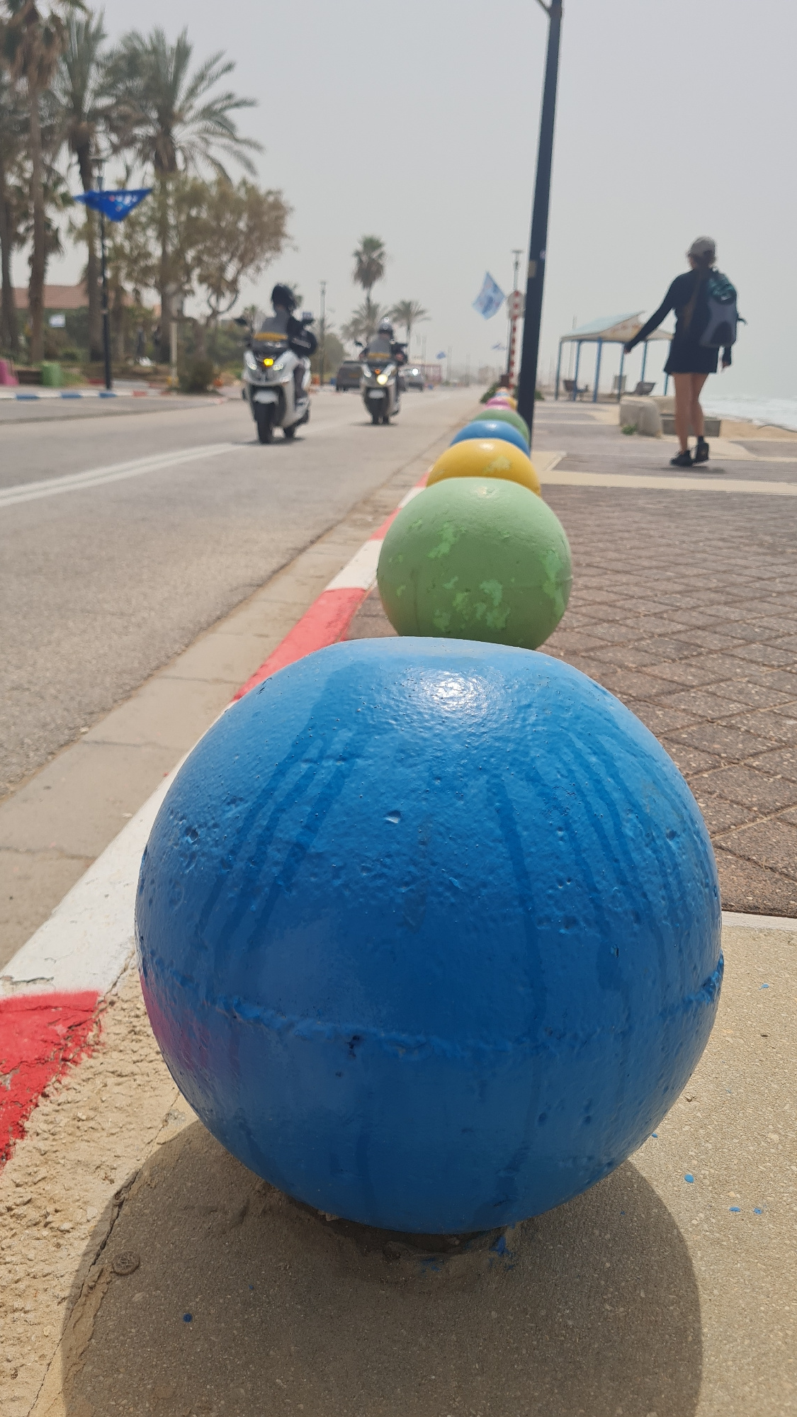 The image shows a row of painted, spherical bollards in a street in Nahariyya, Israel. The bollards are painted blue, green, and yellow, and they line the edge of a sidewalk next to a road. In the bac…read more