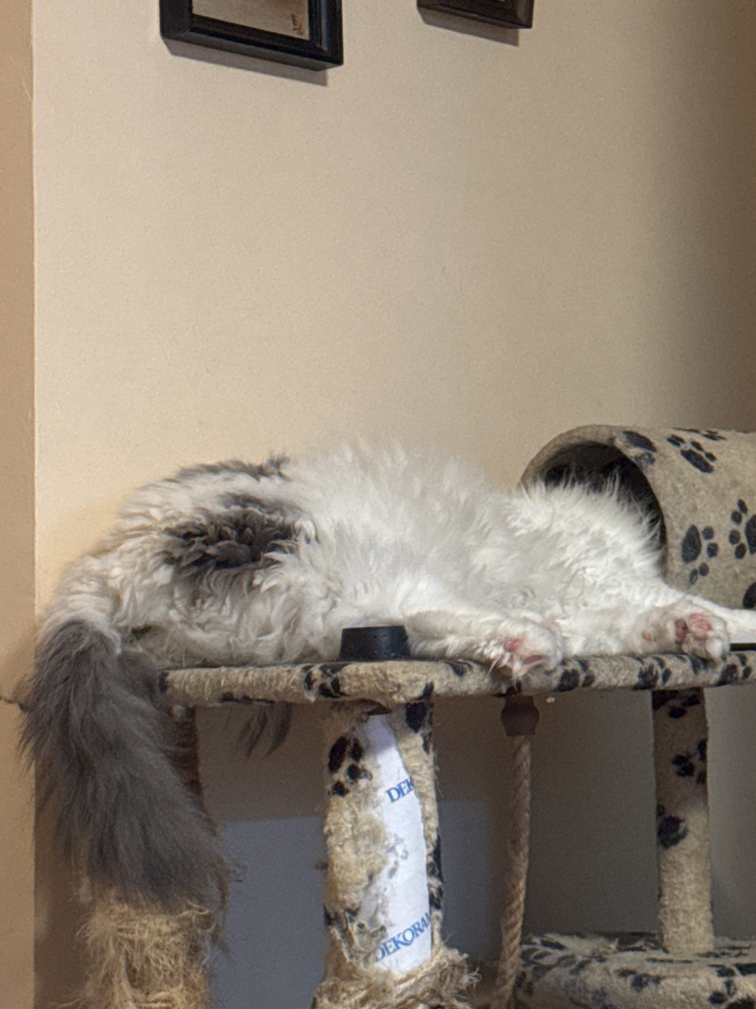 A close-up indoor shot shows a fluffy white and gray cat clinging to a cat tree. The cat tree is covered in patterned fabric and rope. A picture frame is partially visible on a cream-colored wall. The…read more