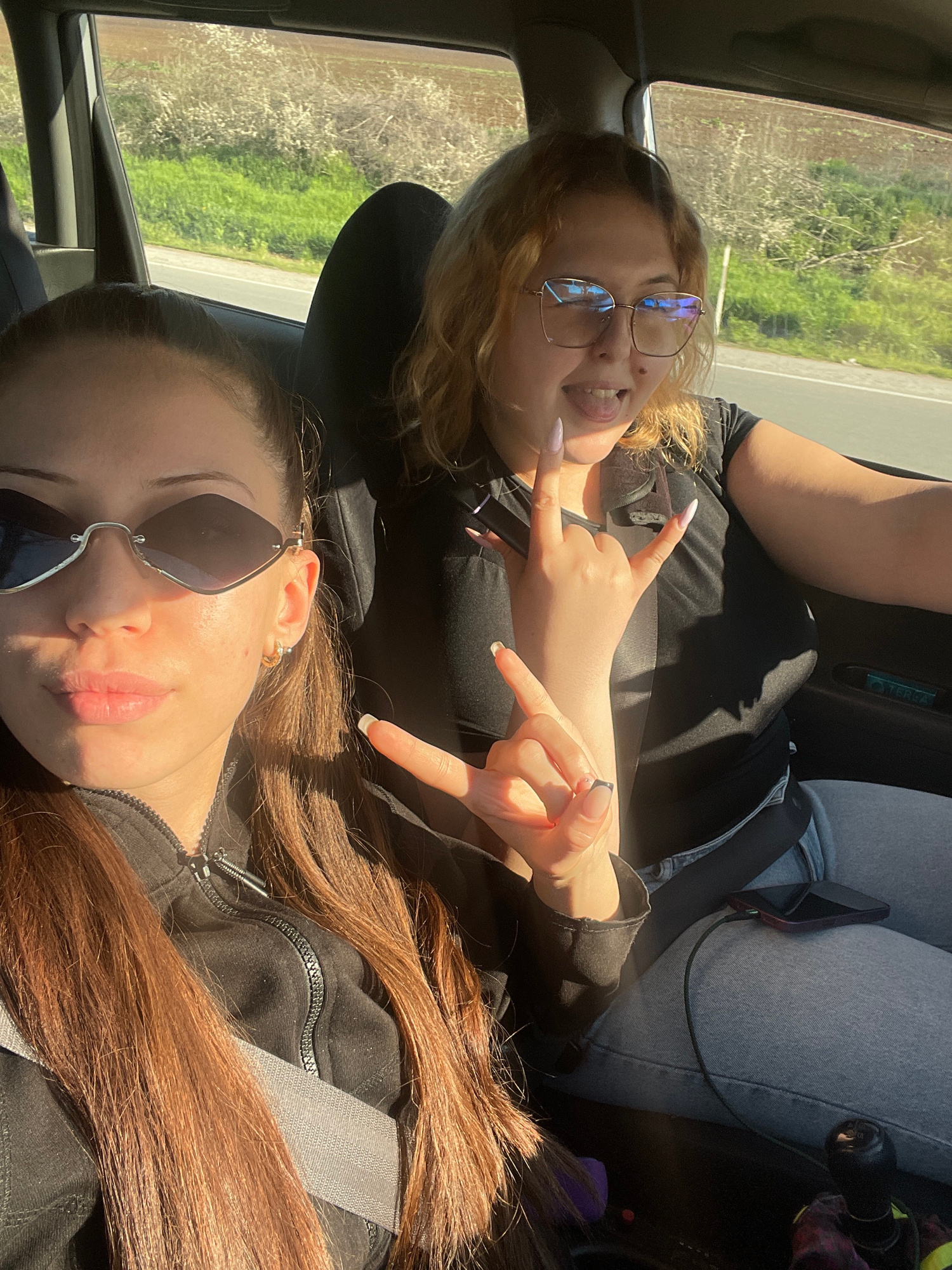 Two young women are sitting in a vehicle. The woman in the foreground has brown hair and is wearing sunglasses and a black jacket zipped up. The woman behind her has blonde hair and glasses and is wea…read more