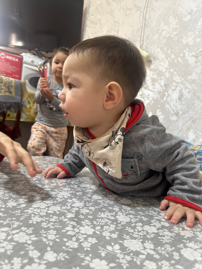 A toddler in a gray and red hooded jacket with a Mickey Mouse bib crawls on a gray floral-patterned surface. Another child with patterned pajamas sits in the background, holding colorful objects. A wa…read more