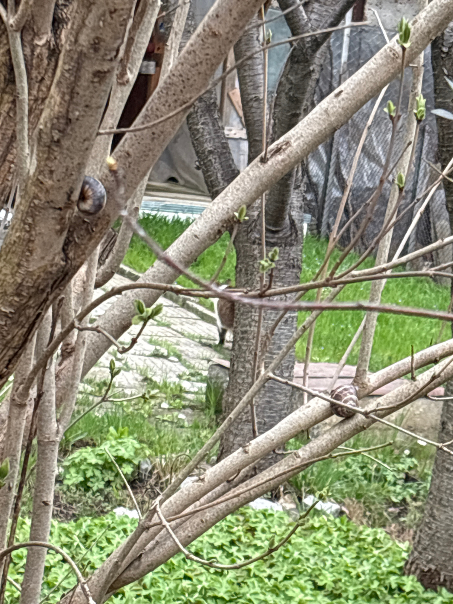 The image presents a close-up view of tree branches with developing buds, positioned against a blurred background of green foliage and architectural elements. Two snails are visible on the branches. T…read more