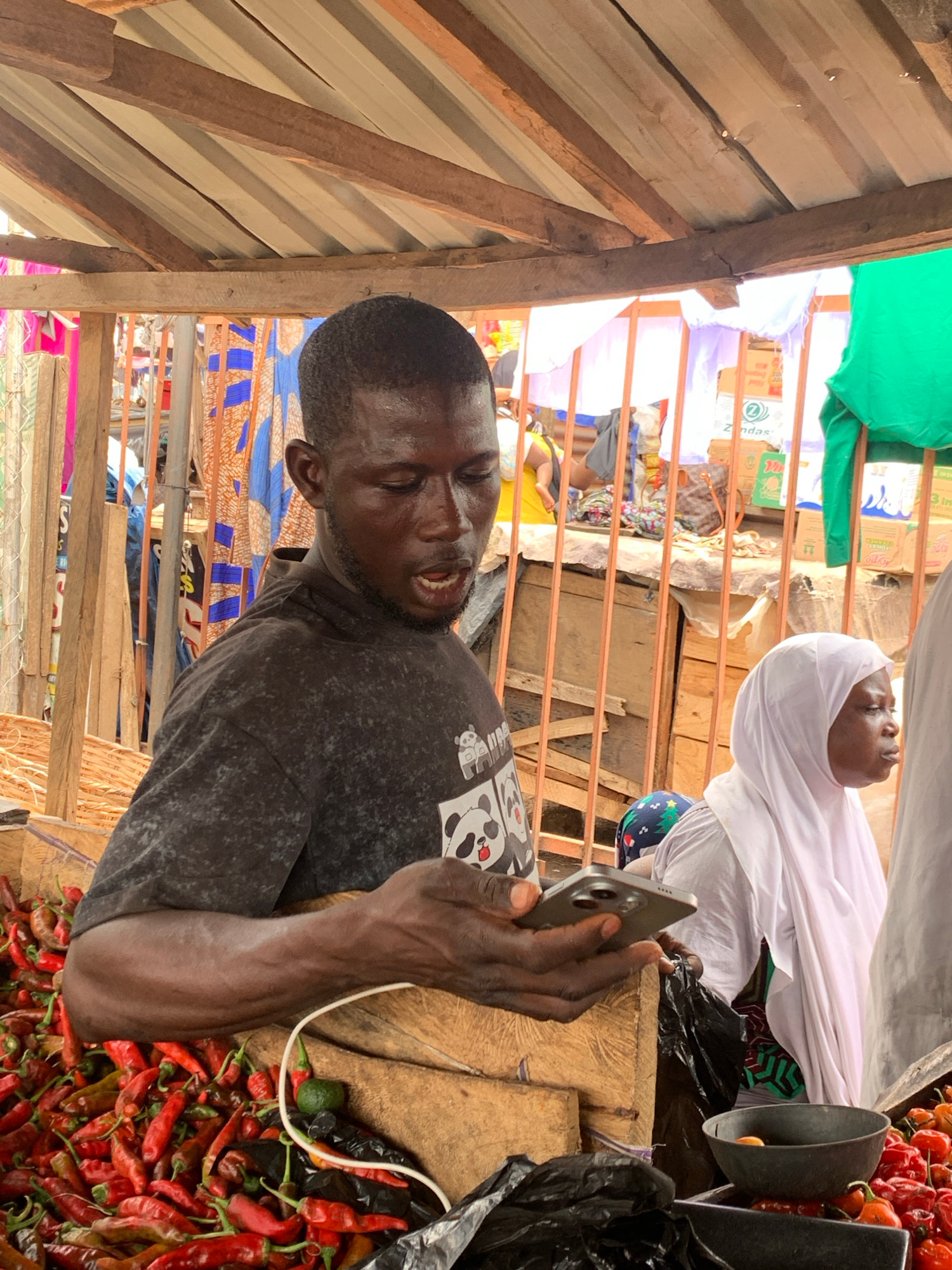 A man is using his smartphone to take a picture or video of a vendor in a market in Ilorin, Nigeria. The vendor, a woman wearing a white hijab, is in the background. The foreground shows the man, a ta…read more