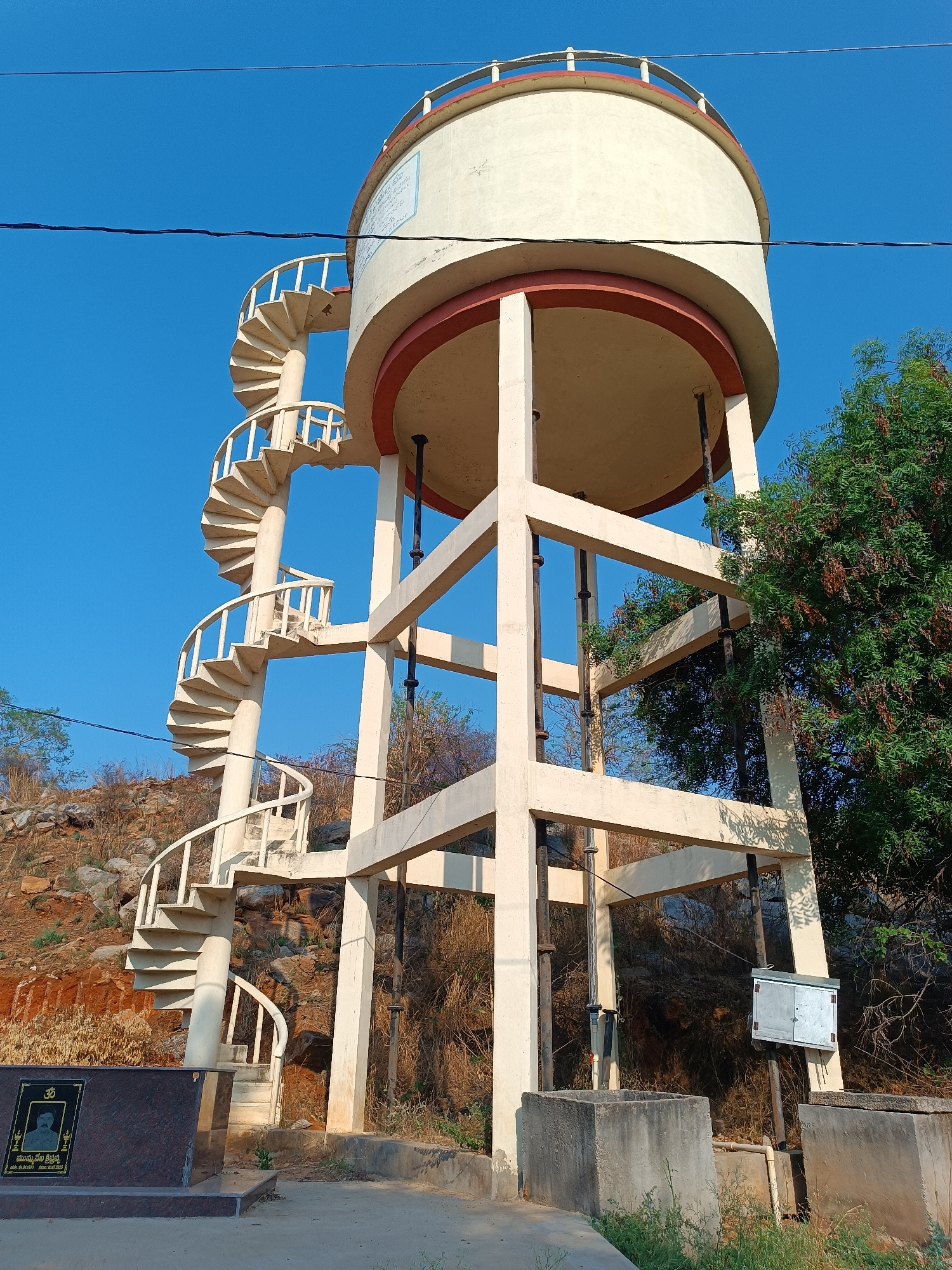 The image shows a water tower in Kammavaripalli, India, under a clear blue sky. The tower has a cylindrical water tank at the top, supported by a framework of square concrete beams. A spiral staircase…read more