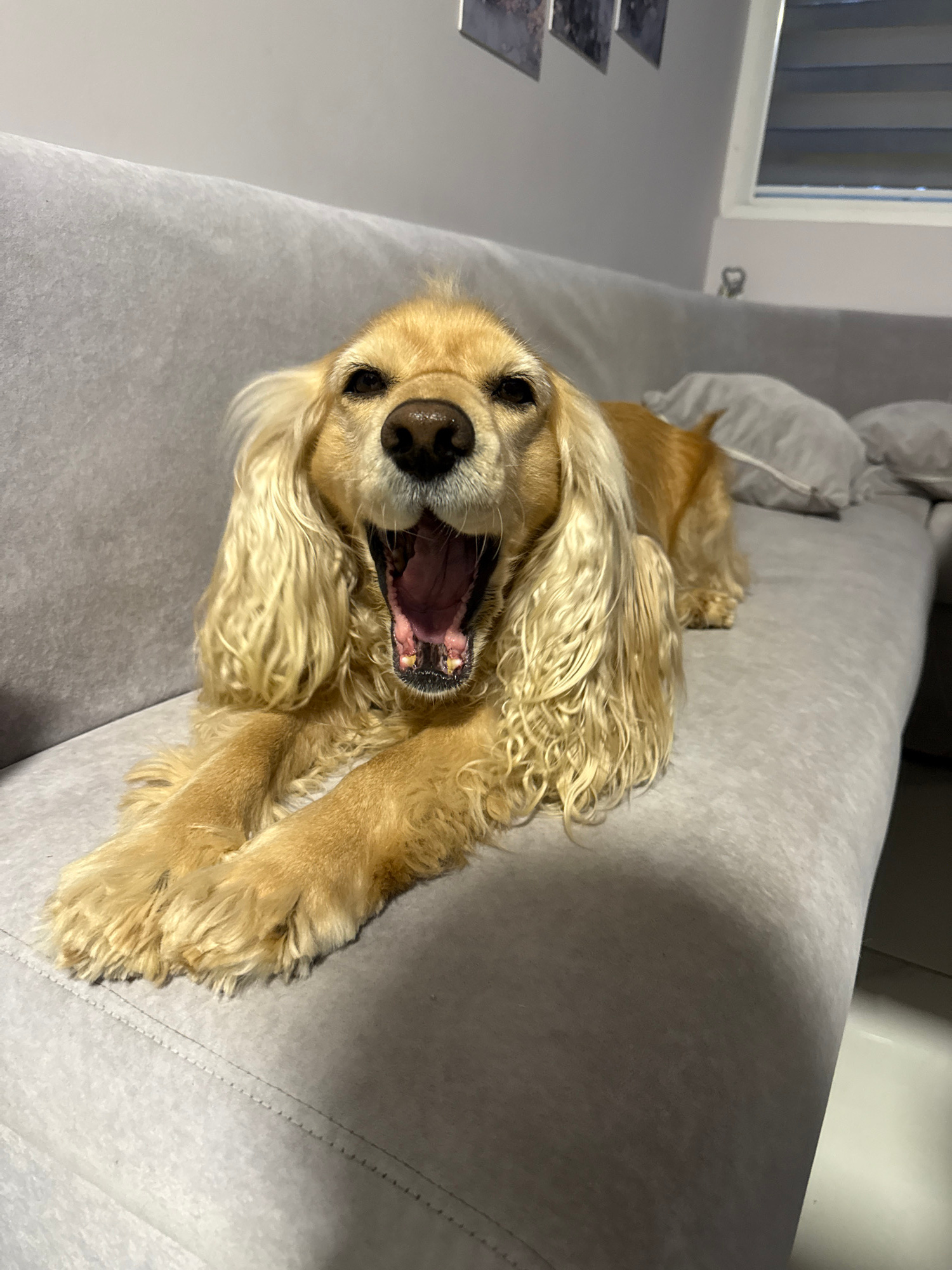 A tan Cocker Spaniel is lying on its back on a light gray couch. The dog's mouth is open in a yawn. The couch is situated indoors, with a window visible in the background. A piece of art hangs on the…read more