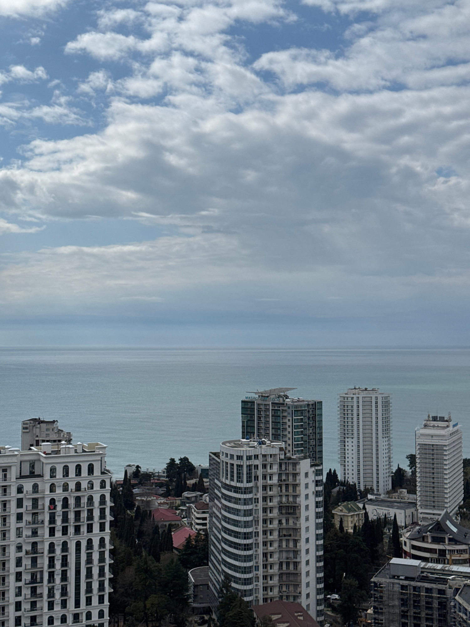 The image shows a view of the city of Sochi, Russia, with the Black Sea in the background. The left side of the image features a sky with scattered clouds. The sea appears calm, with a uniform gray co…read more