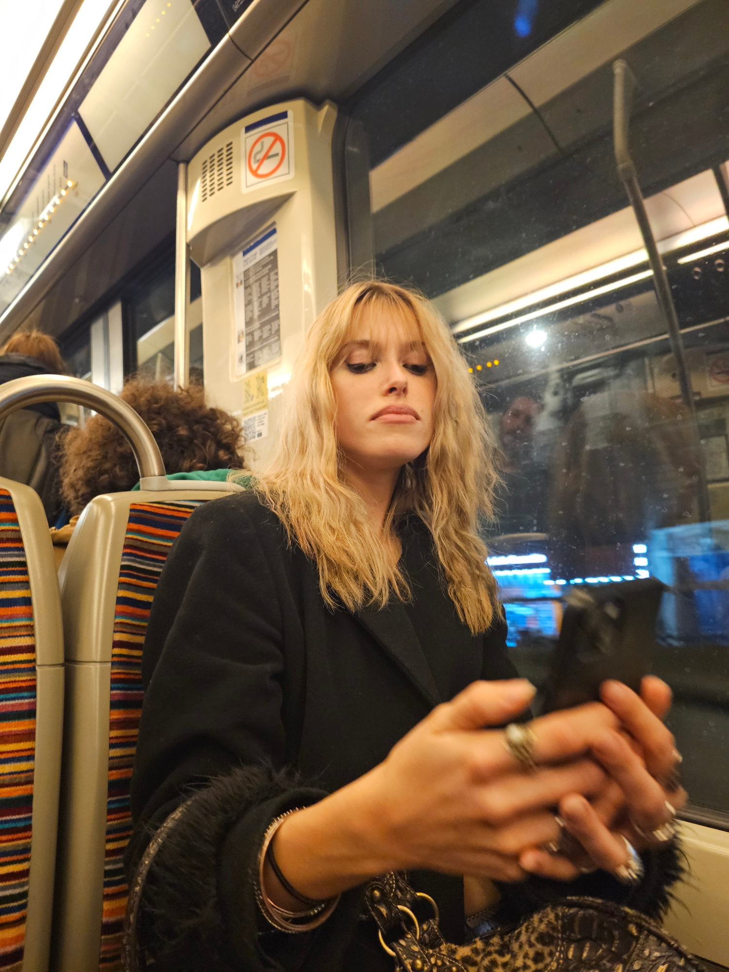 A woman with long blonde hair sits on a train. She wears a black coat and several rings and bracelets. The train seat is striped with orange, blue, brown, and yellow. Overhead, there is a "no smoking"…read more