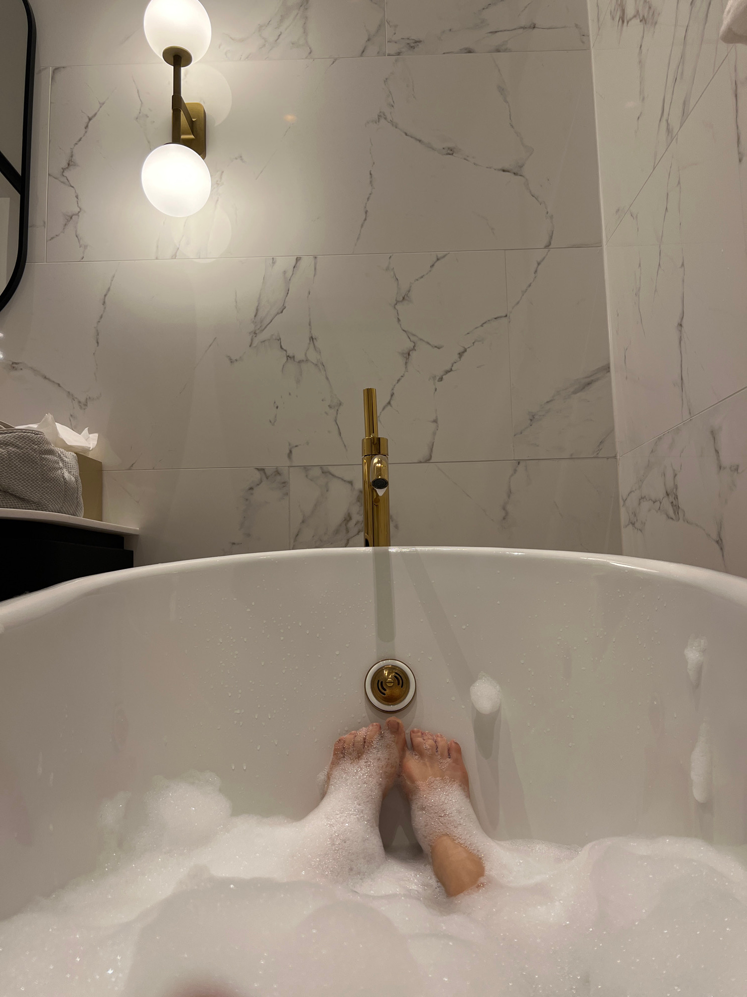 A person's legs and feet are visible in a bathtub filled with soapy water. The bathtub is white and positioned in a bathroom with marble tile walls. A gold-colored faucet and drain stopper are visible…read more