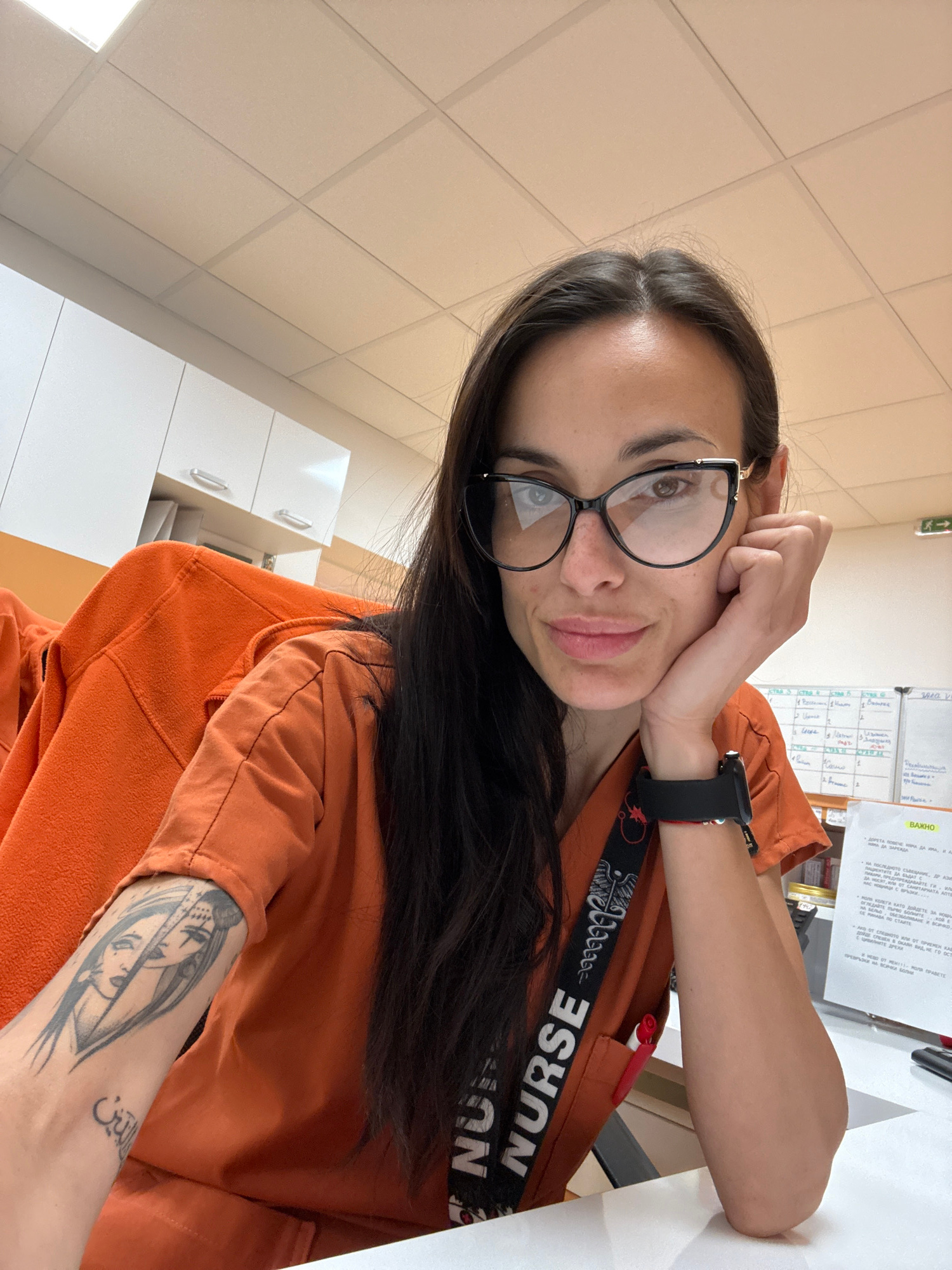 The image depicts a woman with long, dark hair and glasses, wearing an orange "NURSE" uniform with a sleeve tattoo on her left arm. She is resting her head on her hand and appears to be sitting at a d…read more