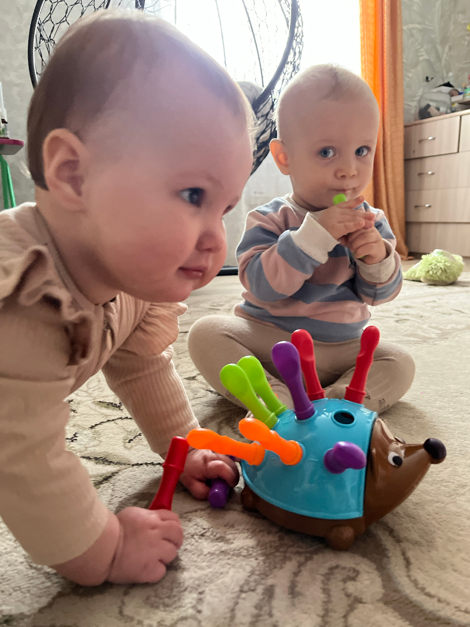 The image depicts two infants in a domestic setting, likely a residence in Novopokrovskaya, Russia. One infant, wearing a beige shirt, is foregrounded, holding a red peg in both hands, interacting wit…read more