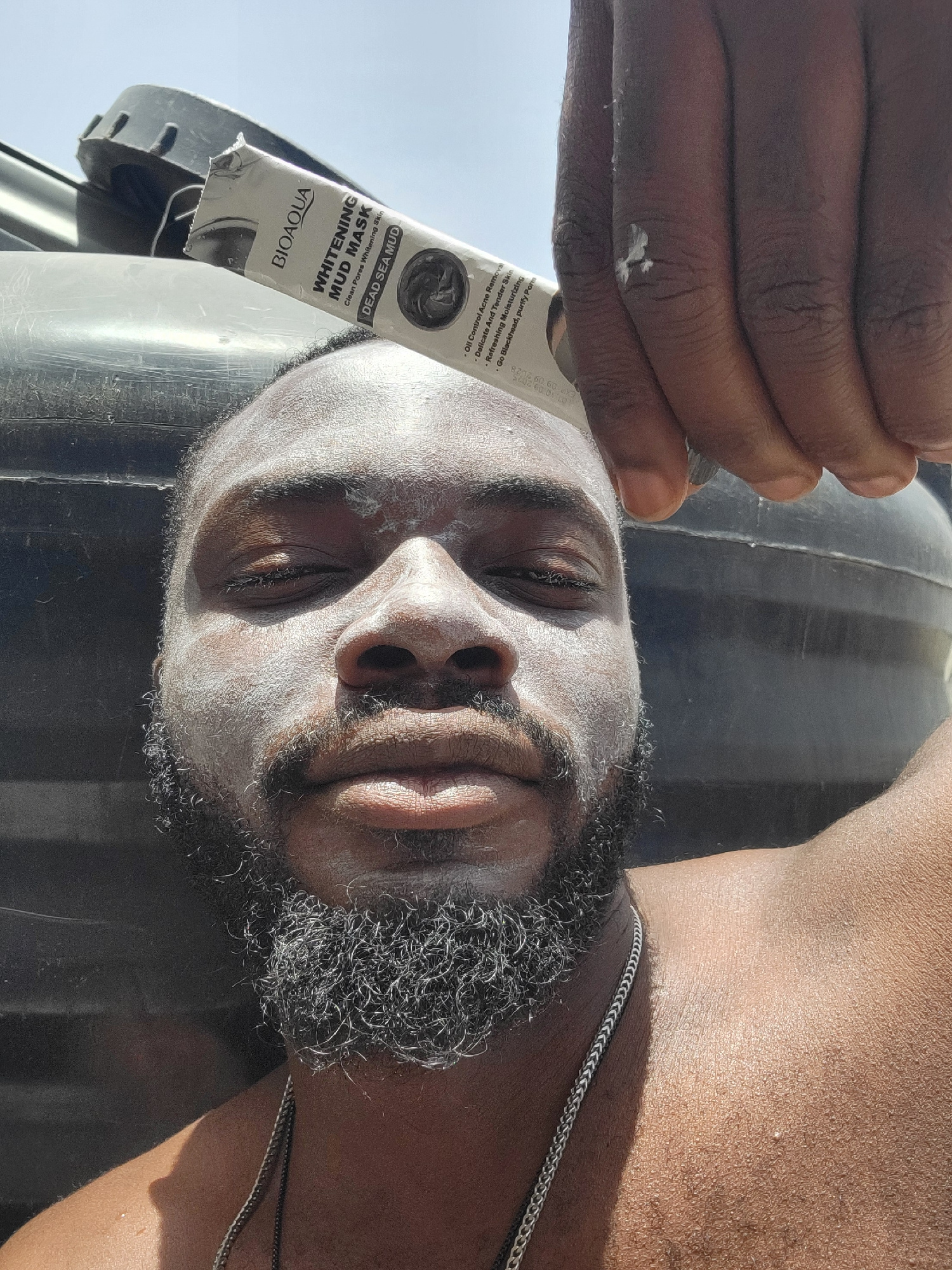 A dark-skinned man with a beard and a coating of white mud mask on his face lies supine, holding a white and black tube of Bioaqua Whitening Mud Mask in his right hand. A drop of the mud mask is visibβ¦read more